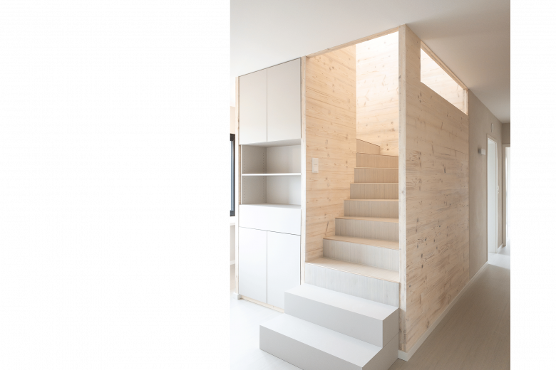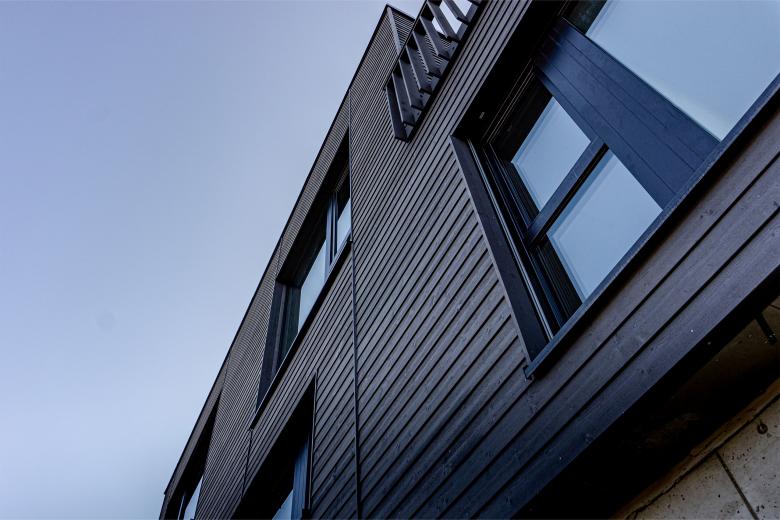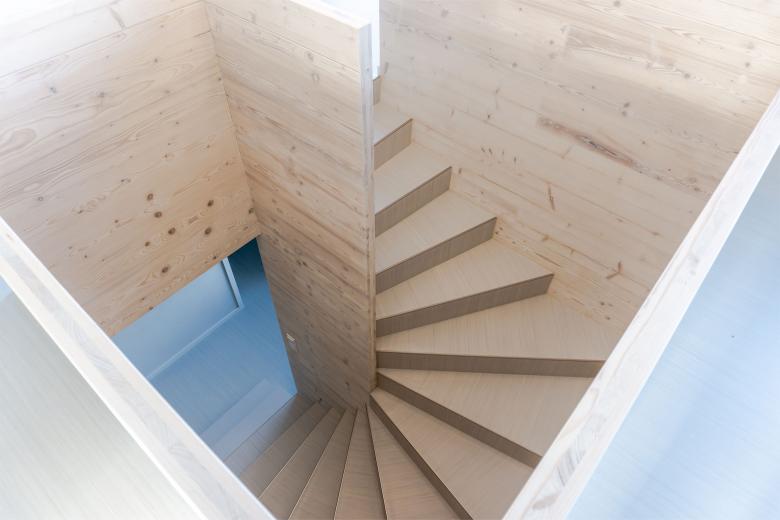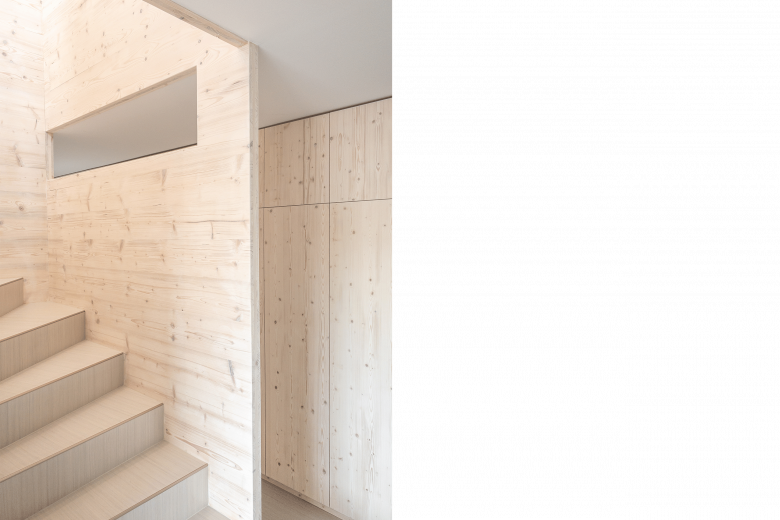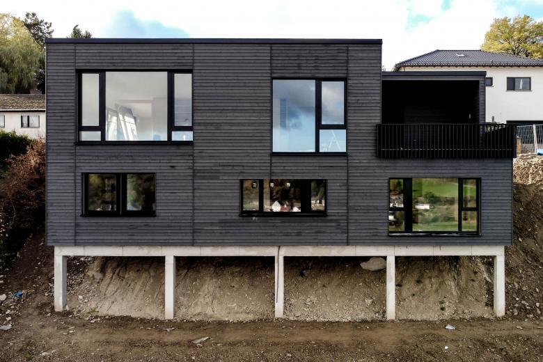 Nur fliegen ist schöner! Ein Einfamilienhaus am Steilhang mit 45° Hangneigung. Ein offenes Wohngeschoss mit einer Terrasse, wie eine Aussichtsplattform. Das Heizkonzept mit 17 Kilowatt Primärenergiebedarf dank Lüftungsanlage mit integrierter Wärmepumpe, 8 Kilowatt-Peak Photovoltaik mit Speicher und ergänzender Infrarot-Folienheizung. Gebaut aus Holzstegträger-Konstruktion mit vorbewitterter Holzfassade, Linoleumböden, Lehmputz, Trockenestrich, Pappwaben-Trittschalldämmung und geöltem Dreischichtplatten-Inventar.