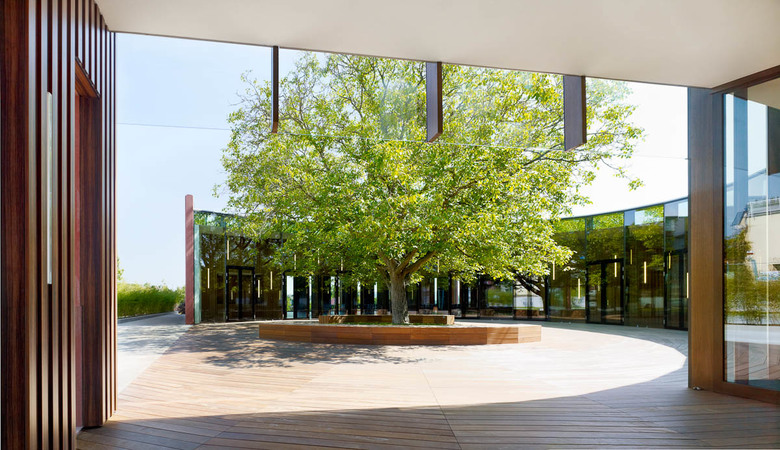 The welcoming stance of the semicircular inner courtyard, with a continuing facade built in structural glazing, contributes to the character of the building and draws the visitor to the heart of it. A curved wall, panelled in walnut, sweeps round to create a single uninterrupted space that surrounds the entire inner courtyard and leads to the main hall. The wall facing onto the tree is wholly glass, including glass doors that can be opened in fine weather to give access to the courtyard.