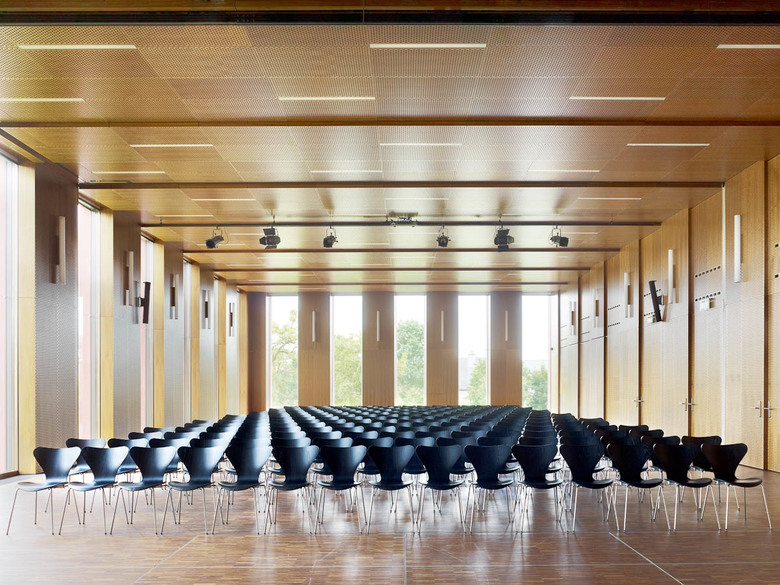 The main hall is of a simple, harmoniously constituted design that is at the same time self-contained yet open to the surrounding landscape. The space can be divided through a mobile partition wall, allowing the different atmospheres from family living room to high-tech multi-functionality. The ceiling and the panels between the windows are finished in walnut veneer and decorated with a pattern of perforations especially designed for this room and its acoustic demands.