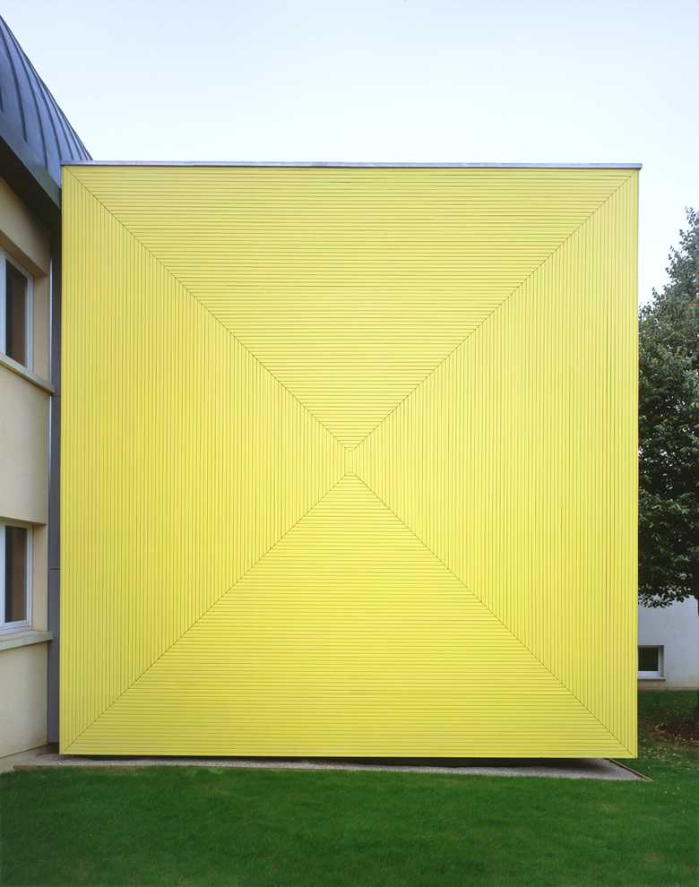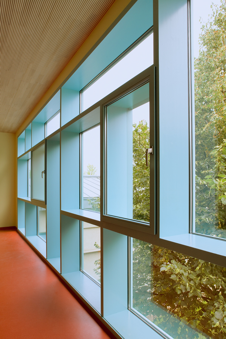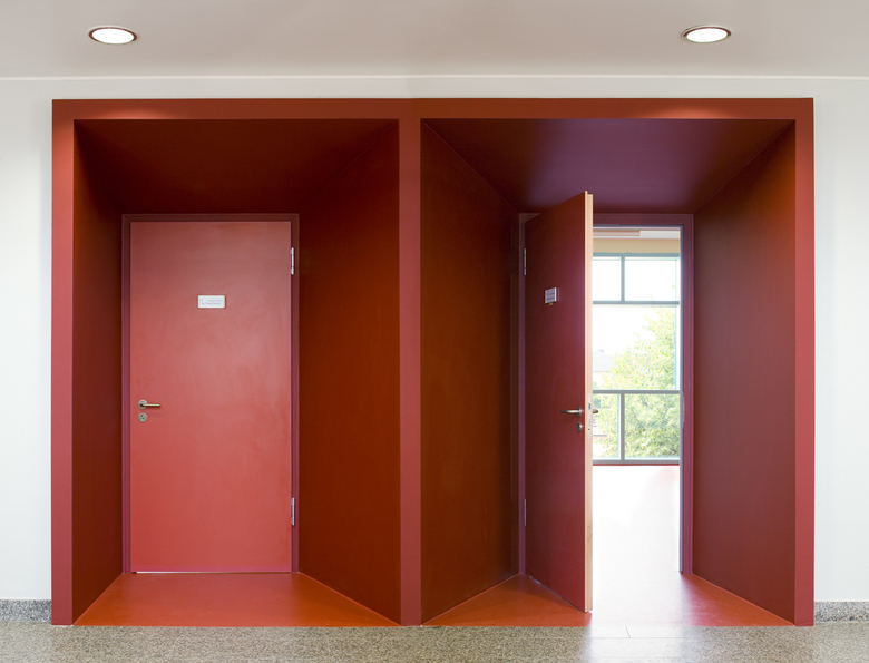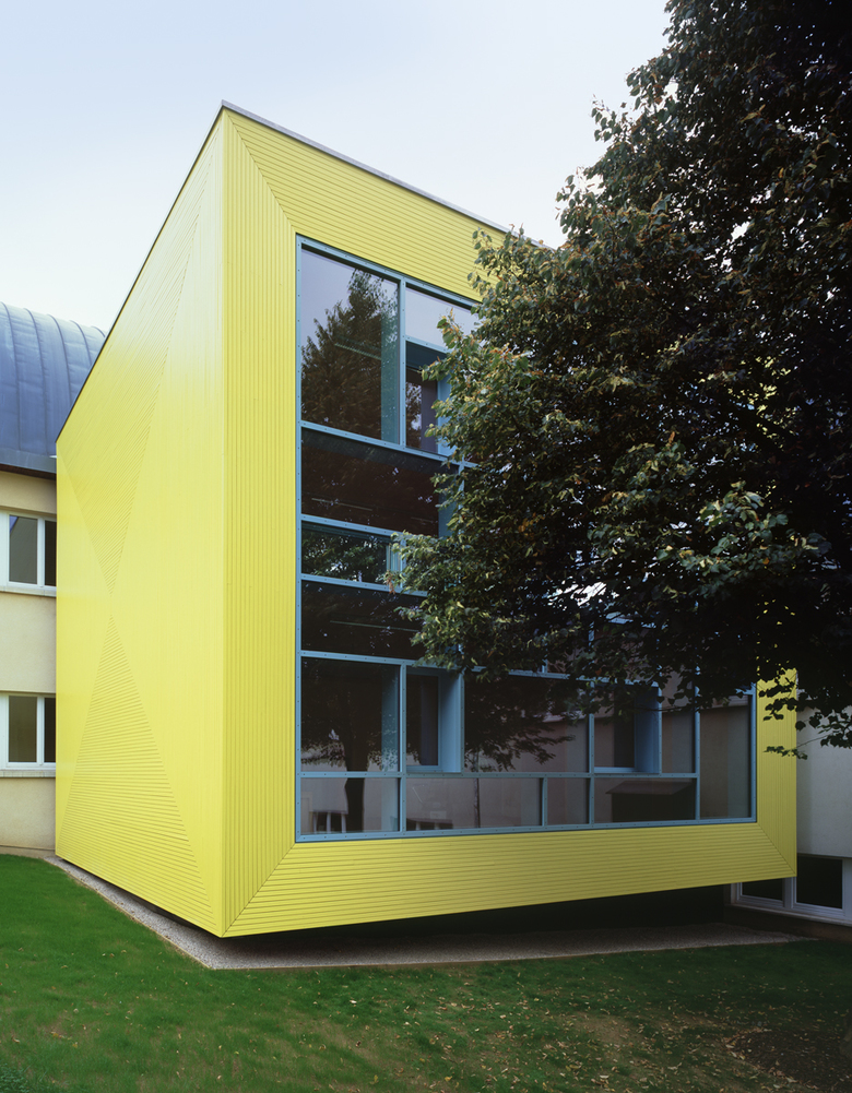Ein rundum zugebauter, nicht zugänglicher und nur über die Korridorfenster einsehbarer Innenhof ist die letzte Platzreserve für dringend benötigten Schulraum. Die Gemeinde Hesperange verzichtete darauf beliebige Containerbauten in diesen Innenhof zu stellen und entschied sich diesen leeren, einzig mit einem Baum bestandenen Ort durch einen architektonischen Eingriff aufzuwerten. Der Hofraum - früher nur Restraum - wurde durch den Anbau belebt und zur Attraktion für den ganzen Schulkomplex und für das angrenzende Quartier.