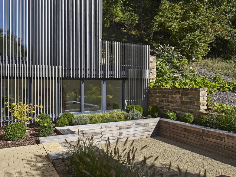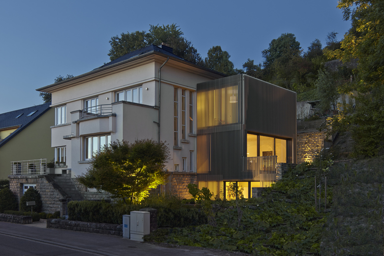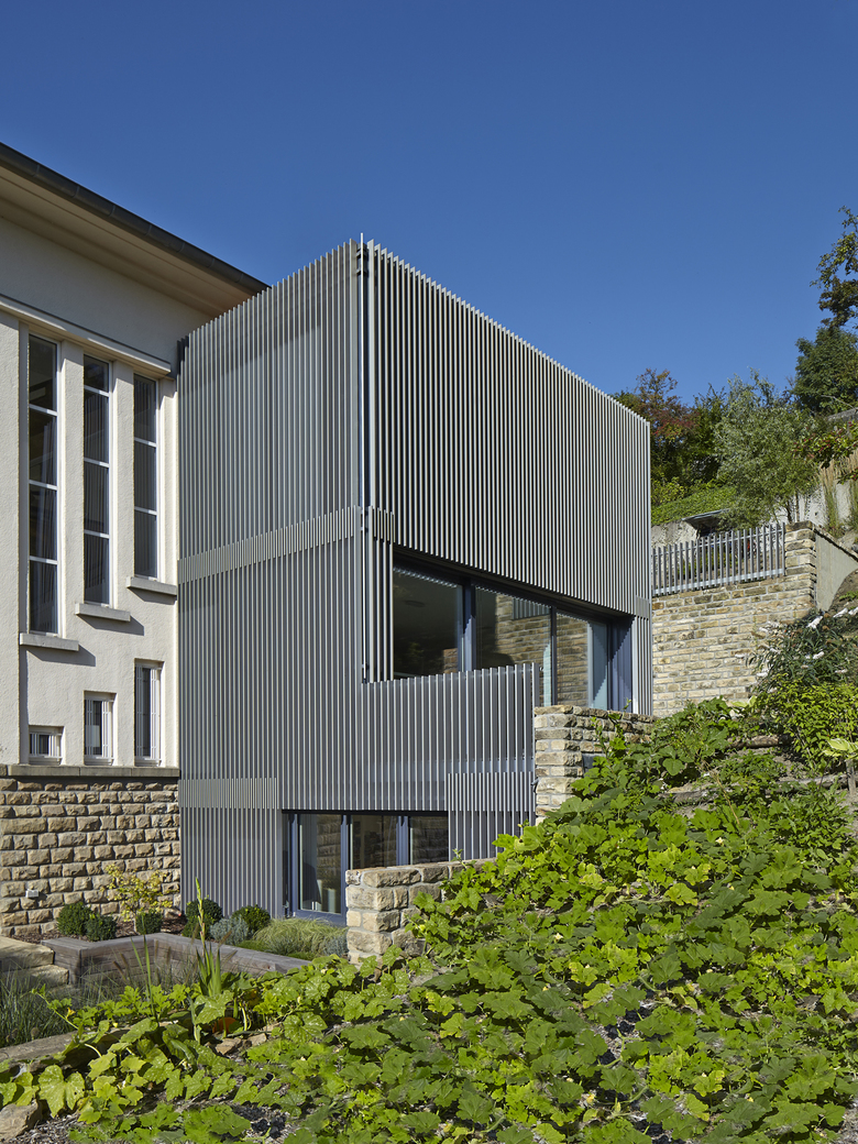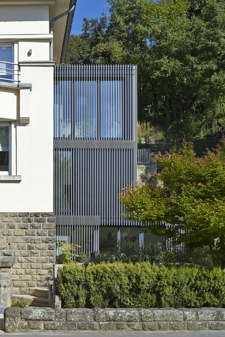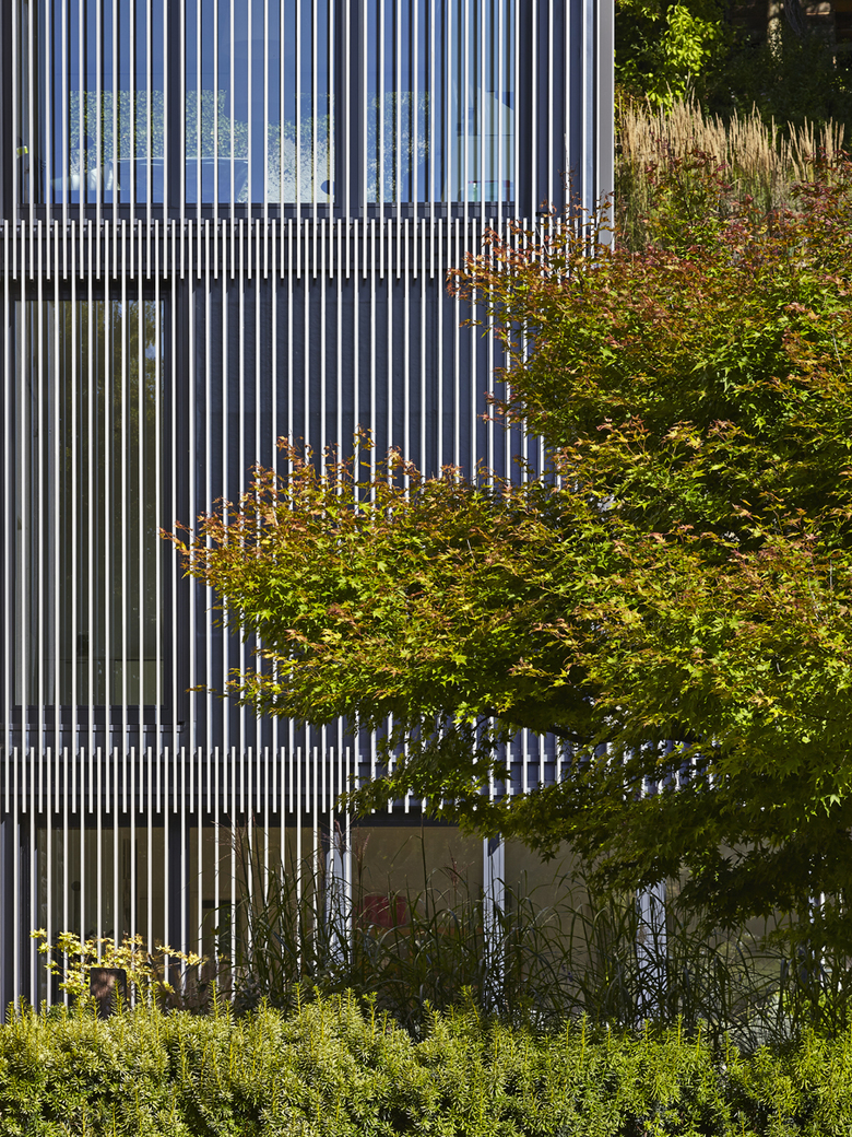 Die vertikale Lamellenstruktur der Fassade schafft eine gewisse Tiefe innerhalb der Fassade und ein optisch sehr abwechslungsreiches Licht- und Schattenspiel. Diese Leichtigkeit kokettiert mit dem kompakten Haupthaus.