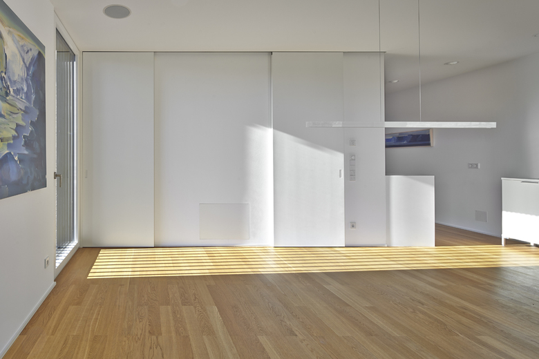 Dem mineralisch verputzen Gebäude wurde ein vertikal gegliedertes Volumen entgegen gesetzt.