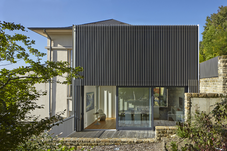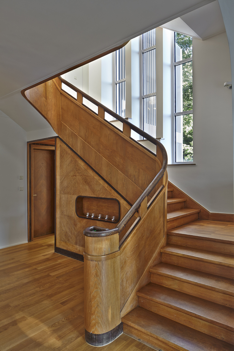 Die vertikalen Schlitzfenster des Treppenhauses vom Haupthaus harmonieren mit der neuen Fassade.