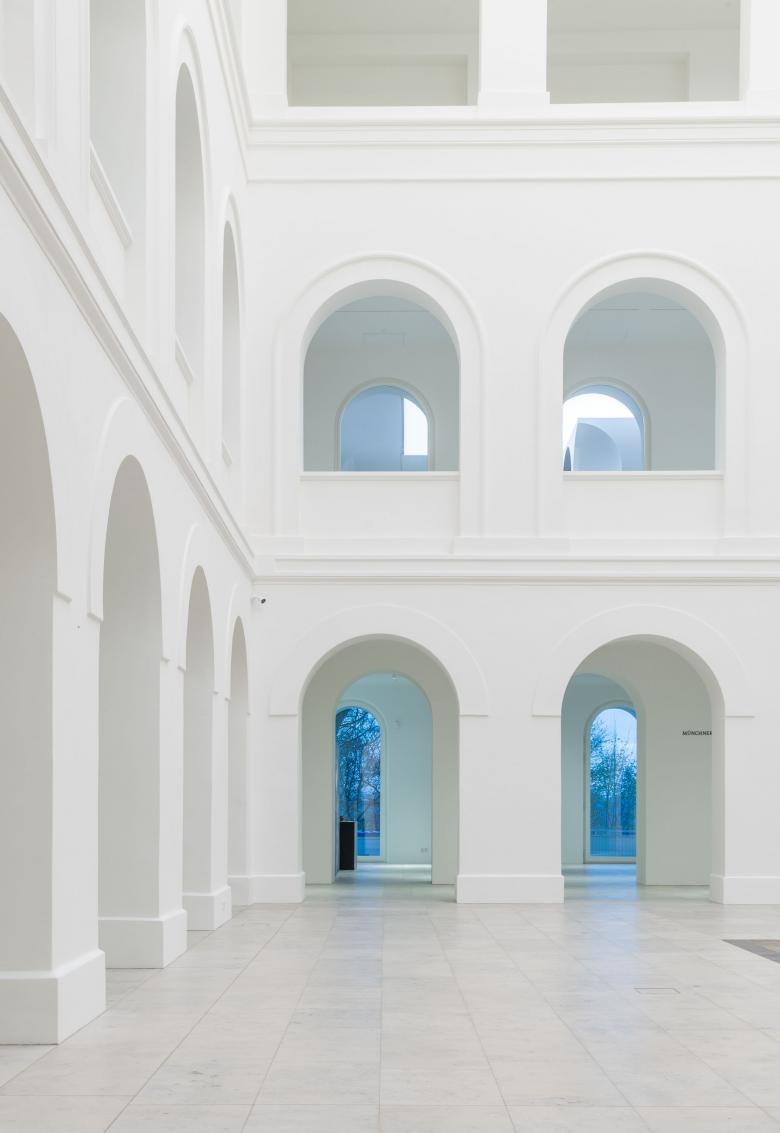 Der Lichthof ist das Herz des Gebäudes, ein echter offener Raum über mehrere Etagen – licht und weit. Wir öffnen ihn zum Himmel. Die Jahres- und Tageszeiten werden zum Erlebnis und sind spürbar. Der Raum spielt mit Licht und Schatten. Eingänge, Übergänge, Durchlässe. Besonderes Licht begrüßt die Besucher in der früheren Kapelle – heute ein Raum der Installation – A Chapel for Luke and his scribe Lucius the Cyrene von James Turrell.