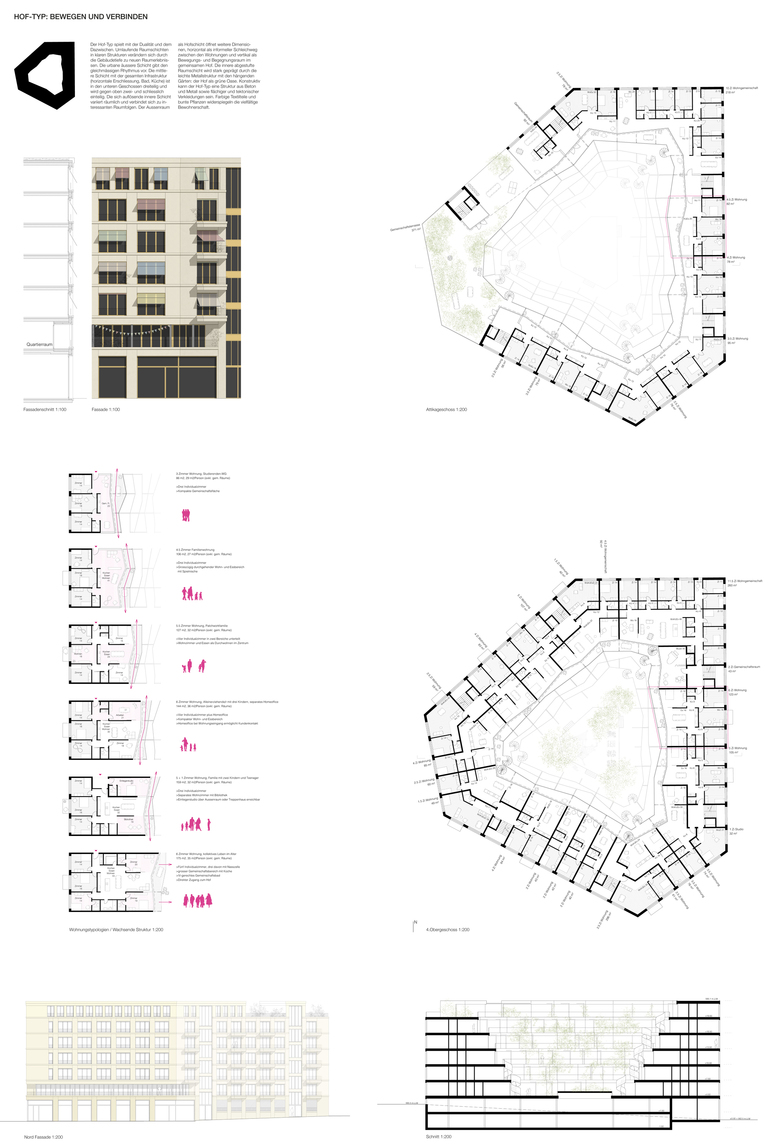 Der Hof-Typ spielt mit der Dualität und dem Dazwischen. Umlaufende Raumschichten in klaren Strukturen verändern sich durch die Gebäudetiefe zu neuen Raumerlebnissen. Die urbane äussere Schicht gibt den gleichmässigen Rhythmus vor. Die mittlere Schicht mit der gesamten Infrastruktur (horizontale Erschliessung, Bad, Küche) ist in den unteren Geschossen dreiteilig und wird gegen oben zwei- und schliesslich einteilig. Die sich auflösende innere Schicht variiert räumlich und verbindet sich zu interessanten Raumfolgen. Der Aussenraum als Hofschicht öffnet weitere Dimensionen, horizontal als informeller Schleichweg zwischen den Wohnungen und vertikal als Bewegungs- und Begegnungsraum im gemeinsamen Hof. Die innere abgestufte Raumschicht wird stark geprägt durch die leichte Metallstruktur mit den hängenden Gärten: der Hof als grüne Oase. Konstruktiv kann der Hof-Typ eine Struktur aus Beton und Metall sowie flächigen und tektonischen Verkleidungen sein. Farbige Textilteile und bunte Pflanzen widerspiegeln die vielfältige Bewohnerschaft.