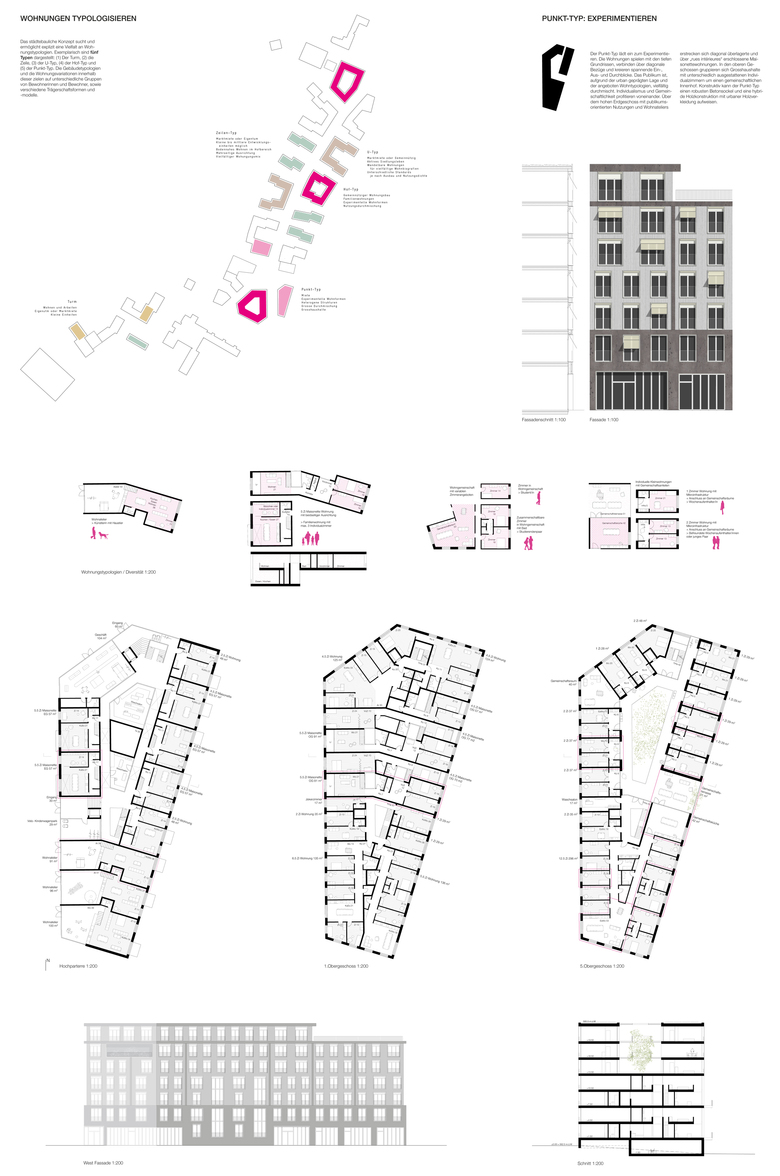 Der Punkt-Typ lädt ein zum Experimentieren. Die Wohnungen spielen mit den tiefen Grundrissen, verbinden über diagonale Bezüge und kreieren spannende Ein-, Aus- und Durchblicke. Das Publikum ist, aufgrund der urban geprägten Lage und der angeboten Wohntypologien, vielfältig durchmischt. Individualismus und Gemeinschaftlichkeit profitieren voneinander. Über dem hohen Erdgeschoss mit publikumsorientierten Nutzungen und Wohnateliers erstrecken sich diagonal überlagerte und über "rues intérieures" erschlossene Maisonettewohnungen. In den oberen Geschossen gruppieren sich Grosshaushalte mit unterschiedlich ausgestattenen Individualzimmern um einen gemeinschaftlichen Innenhof. Konstruktiv kann der Punkt-Typ einen robusten Betonsockel und eine hybride Holzkonstruktion mit urbaner Holzverkleidung aufweisen.
