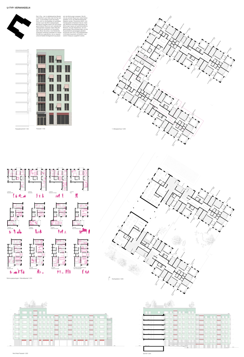 Der U-Typ – der im städtebaulichen Muster in Extremform auch Zeile oder Hof-Typ sein kann – ist die Addition eines Grundtyps. Doch nicht nur die Stadtfigur ist wandelbar, sondern auch die Wohnungstypologien. Mit kleinen Eingriffen lassen sich die präzise geschnittenen Räume an sich verändernde Lebensentwürfe anpassen: WG, Wohnen kombiniert mit Homeoffice, offener Grundriss in der Kleinfamilie, einfaches Unterteilen für höhere Intimität der Jugendlichen, untervermietete Einliegerwohnung. Die Küche als zentraler Raum kann dabei flexibel gestaltet und an die Öffentlichkeitsgrade adaptiert werden. Persönliche Wohn- und Hausbiografien hinterlassen Spuren. Dank des effizienten Erschliessungssystems der Wohnungen lassen sich gemeinschaftliche Bereiche wie das Treppenhaus, die erdgeschossigen Raumerweiterungen und die Aussenbereiche grosszügiger gestalten. Konstruktiv kann der U-Typ beispielsweise mit Einsteinmauerwerk und farblich nuanciertem Kratzputz ausgeführt werden.
