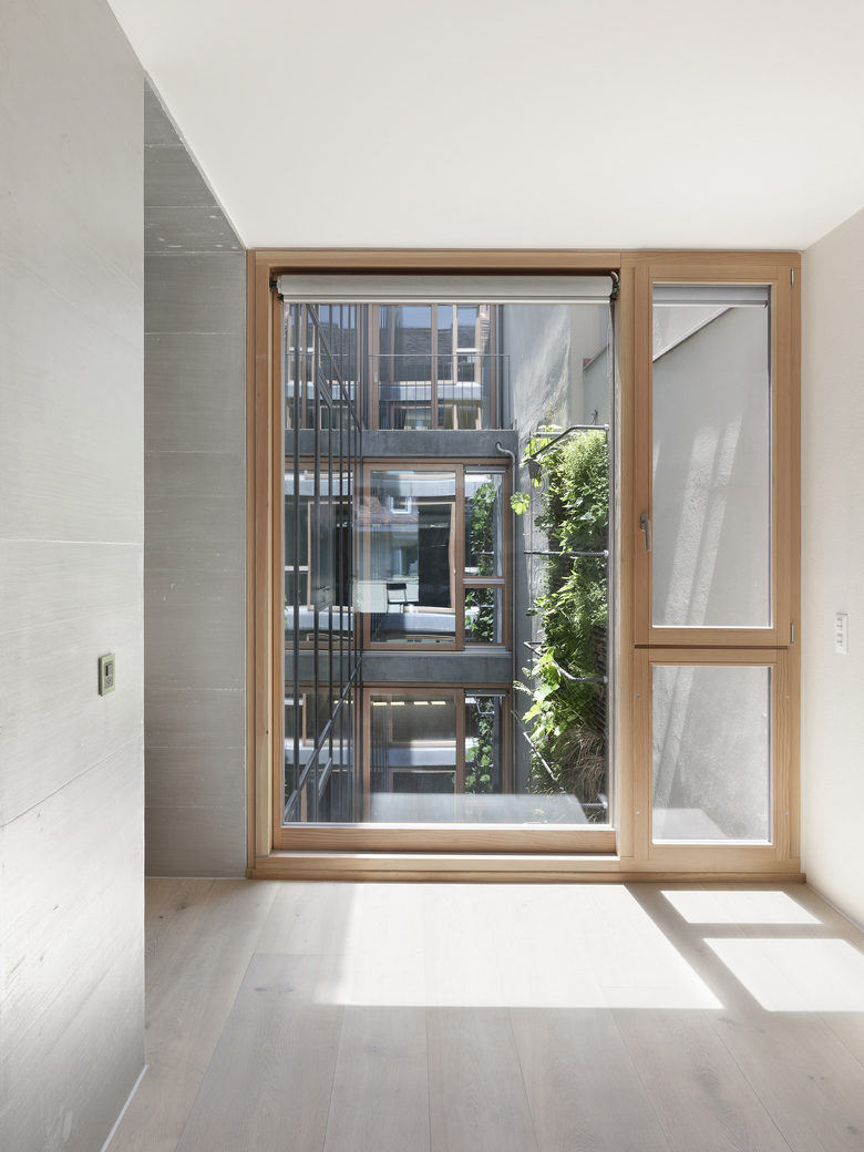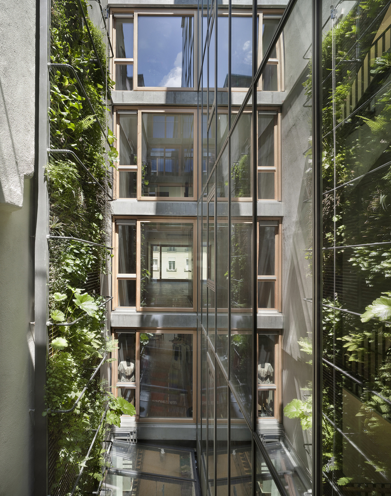 Die Liegenschaft in der Berner Innenstadt ist Teil des zähringischen Stadtmusters und heutigen UNESCO-Weltkulturerbes. Eine kritische Orts- und Gebäudeanalyse führt zu einer differenzierten Erneuerungsstrategie. Das Vorderhaus gegen die Spitalgasse wird in seiner Struktur und im Ausdruck erhalten und in der Bedeutung als Haupthaus volumetrisch gestärkt. Rückwärtig werden auf der fünf Meter breiten und fünfzig Meter tiefen Parzelle anstelle der Gebäude aus den 1920/30er Jahren ein schlichter, moderner und zukunftsgerichteter Ersatzneubau erstellt. Zwischen Vorder- und Hinterhaus bildet ein für die städtische Situation typischer Innenhof den Übergang, schafft räumliche Bezüge und gute Belichtung. Eine begrünte Vegetationswand prägt in diesem Innenhof die von allen Räumen einsehbare innere Schnittstelle und verleiht dem Ort eine unverkennbare Identität. Ladenräume im Erd- und 1. Obergeschoss, Dienstleistungsräume im 2. und 3. sowie drei Wohnungen im 4. bis 6. Obergeschoss mit gegen den Hof terrassierten Aussenräumen bilden die urbane Nutzungsvielfalt. Aufgrund der ausgeprägten städtische Lage und trotz abgestufter Volumetrie ist die Gebäudeoberfläche relativ klein. Kern der Gebäudetechnik bildet eine effiziente Wärmerückgewinnung über Lüftungsgeräte. Raumtemperatur und Warmwasser werden primär mit einer Wärmepumpe/Kälteanlage erzeugt, sekundär mit Gas.