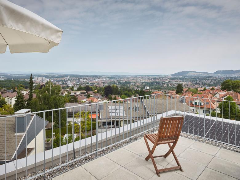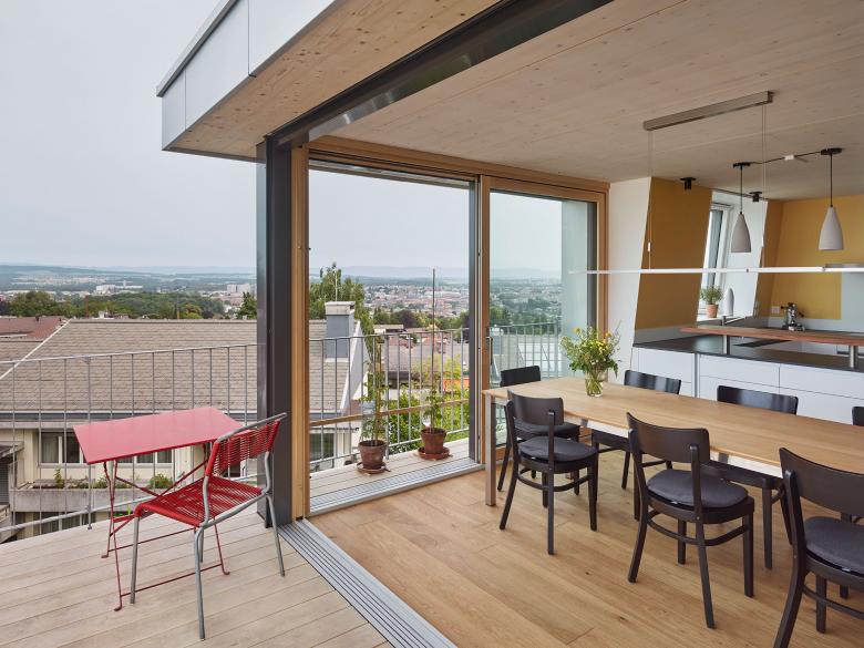Das bestehende Satteldach wurde durch eine aufgesetzte Holzbaukonstruktion, die das Attikageschoss bildet, ersetzt – eine in ökologischer wie auch ökonomischer Hinsicht sinnvolle Lösung. Durch die maximale Ausnützung der Gebäudehöhe wird der Blick auf die Stadt Bern ermöglicht und in der Grundrissstruktur thematisiert. Die Aufstockung macht die Dachform zum Thema: Das interpretierte Mansardendach vermag die neue Volumetrie ortsverträglich zu dimensionieren, der Materialwechsel zu Holz definiert den Übergang zwischen Alt und Neu.