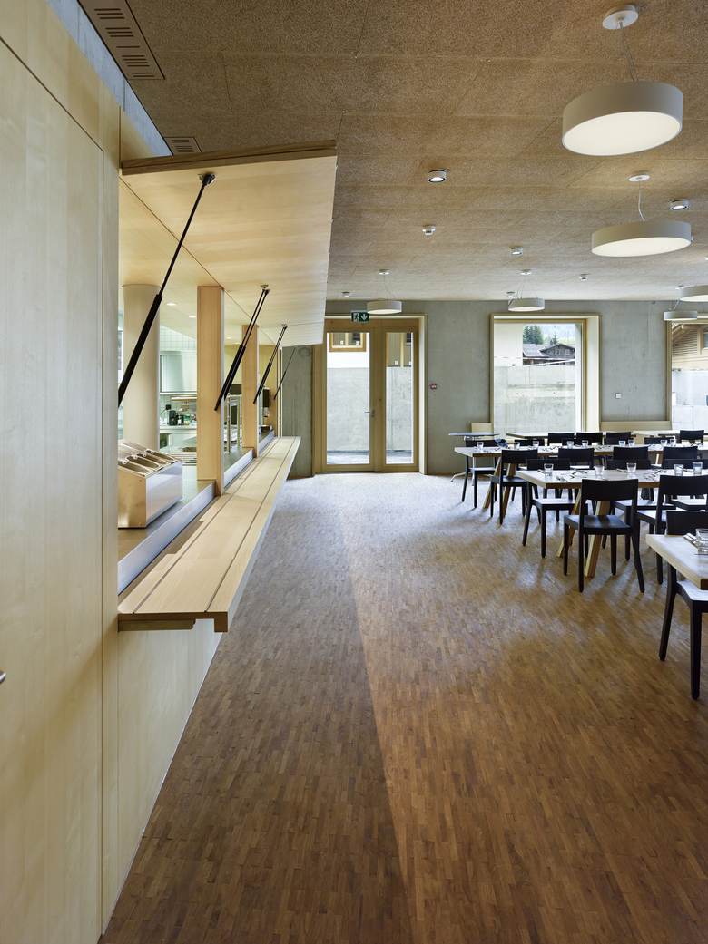 Die Charakteristiken der traditionellen Aussen- und Zwischenräume werden übernommen. Ein Knick im Grundriss unterstreicht den wichtigsten Aussenbereich unter dem Giebelvordach und stärkt das Raumgefühl der Geborgenheit. Die Zwischenzonen unter den traufseitigen Lauben und Vordächern werden über Wandauskragungen, ein vertikales Schalungsbild sowie raumhaltige Tür- und Fensteröffnungen abstrahiert und vermitteln mit den vorgelagerten Spiel- und Aufenthaltsbereichen zur Landschaft.