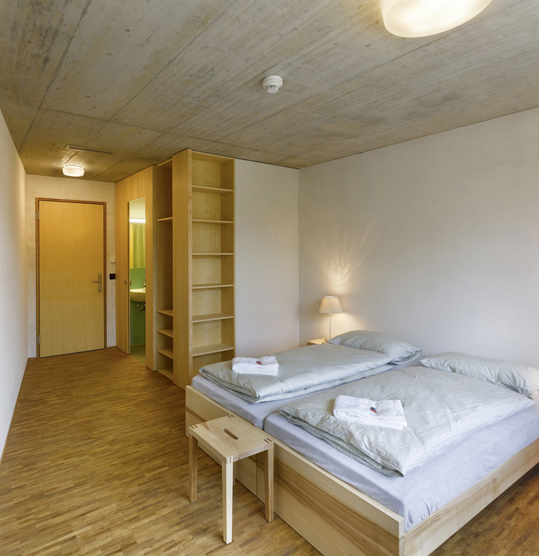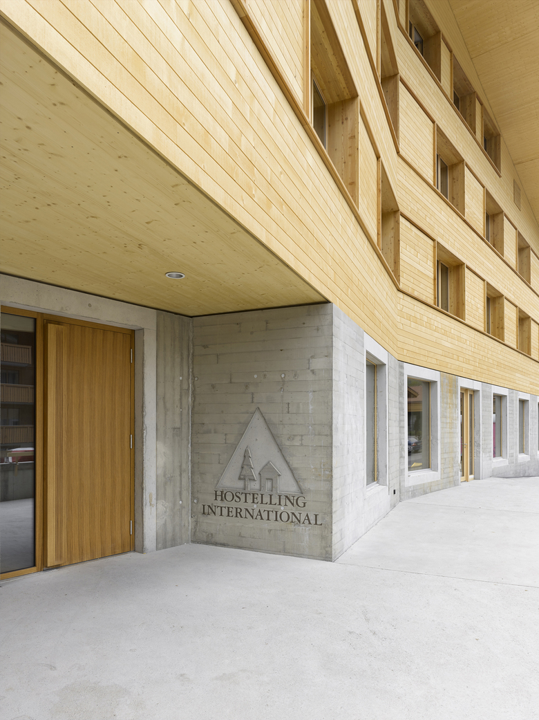 Der von starken Schalungsfugen gezeichnete Betonsockel mit Lochfenstern kontrastiert und verbindet gleichzeitig in der Oberflächentextur mit der feinen Holzschalung und einer bänderartig zusammengefassten Befensterung in den Obergeschossen. Die innenräumliche Gliederung nimmt die in der Situationslösung sichtbare Haltung auf und spielt mit der Dynamik von offenen und geschlossenen Bereichen und schafft Bezüge in die Nähe und Weite. Die Räume sind in unterschiedliche Nutzungszonen mit differenzierten Öffentlichkeitsgraden gegliedert: Das Erdgeschoss mit dem Eingangs- und Gemeinschaftsbereich, die Obergeschosse mit den Schlafbereichen mit total 160 Betten. Mit dem integralen Gebäudekonzept und entsprechender Gebäudetechnik sowie kluger Materialwahl wird der Standard Minergie-P-ECO erreicht.