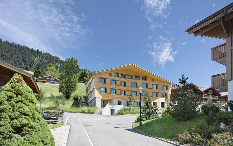 Typische Elemente des Saanenländer Hauses und der Umgang mit der Topografie werden im Neubauprojekt für die Jugendherberge Saanen neu interpretiert. Mit einer präzisen Verortung und asymmetrischen Ausformulierung reagiert das Gebäude auf den spezifischen, von starker Bautätigkeit geprägten Ort. Das Zentrum der Fassade wird aus der Mitte verschoben, die perspektivische Wirkung dadurch verstärkt. Das Hauptvolumen öffnet sich so zum offenen Raum Richtung Saanen und zeichnet den Eingangs- und Aufenthaltsbereich aus und wird zu einem erkennbaren Zeichen im Siedlungsgefüge.