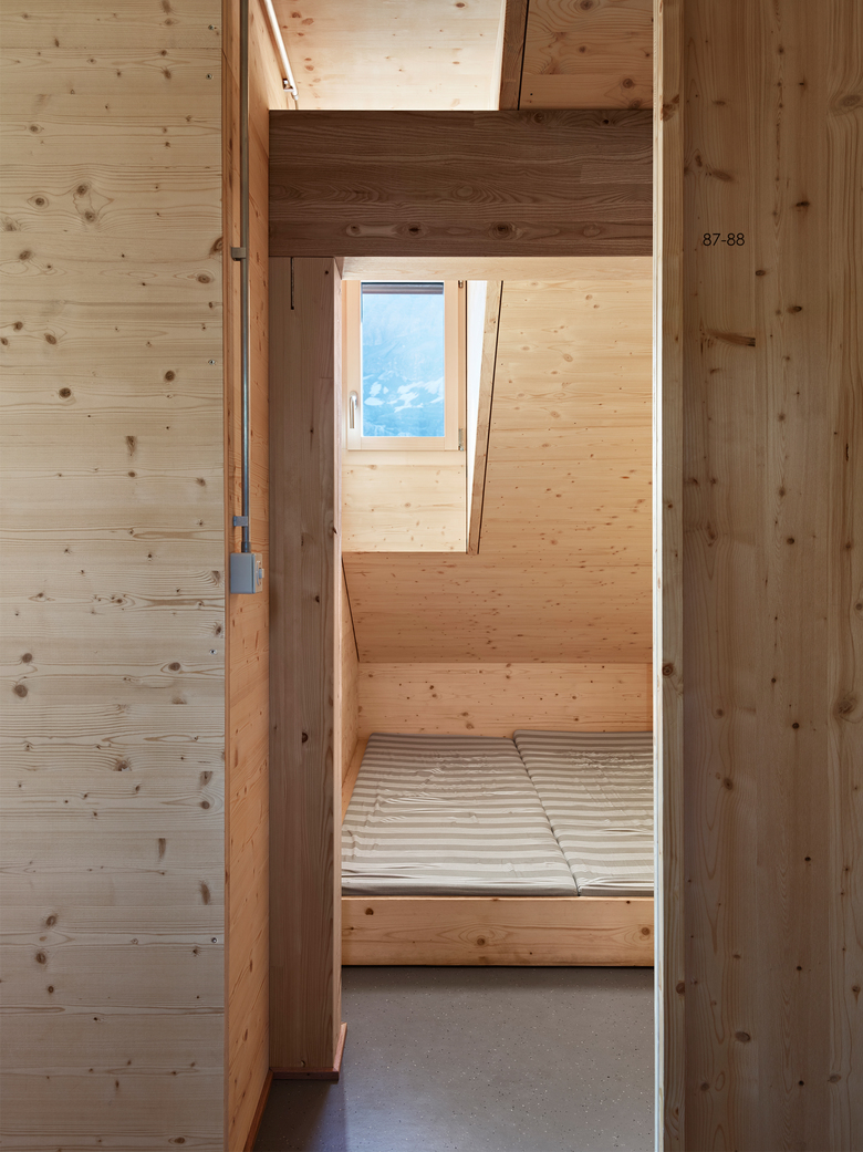 Vor- und Rücksprünge schaffen im Sockelgeschoss einen schützenden Eingangsbereich. Mit der südöstlichen Erweiterung und der inneren Neuorganisation erhalten alle Geschosse mehr Raum, was die betrieblichen Abläufe optimiert. Vergrösserte Küche, neue Wasch- und Toilettenanlagen, klar definierte Besucher- und Personalbereiche sowie die räumliche Erweiterung der Ess- und Aufenthaltszone erzeugen einen angemessenen Komfort. In den Obergeschossen werden die (wie bisher) 98 Schlafplätze in attraktiven kleineren Räumen angeboten.