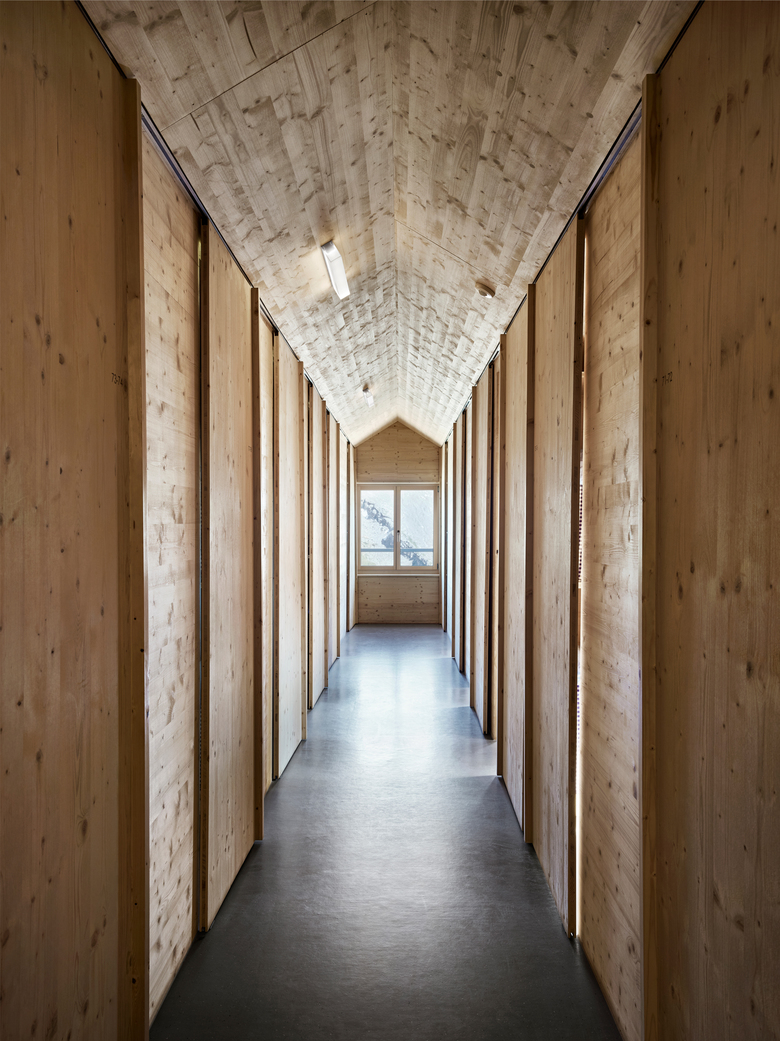 Die selbstverständlich wirkende talseitige Erweiterung stärkt diese Qualitäten und verbindet alte und neue Teile zu einem wohl proportionierten Ganzen. Erst der zweite Blick lässt feine räumliche, tektonische und materialmässige Brüche und Übergänge erkennen, z.B. über Details in der äusseren Lärchenschalung oder der inneren Oberflächenbehandlung, über die Fensteröffnungen, die integrierten Solarelemente oder die farblichen Akzente der roten Fensterläden und -leibungen.