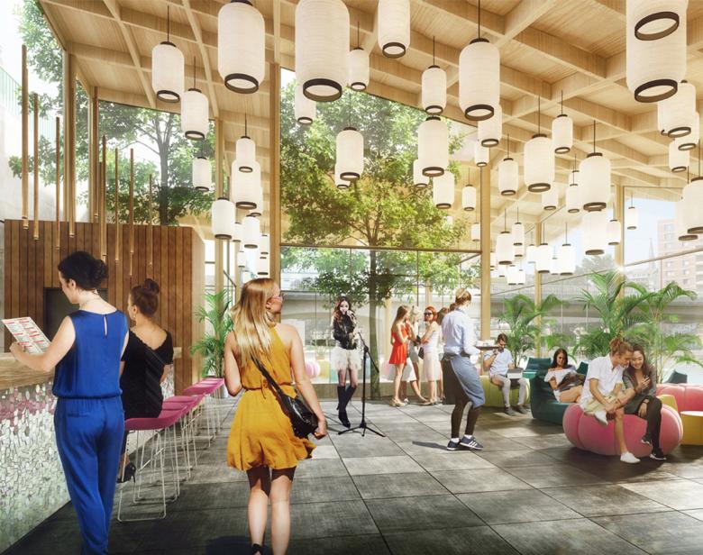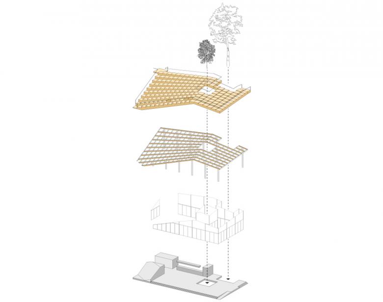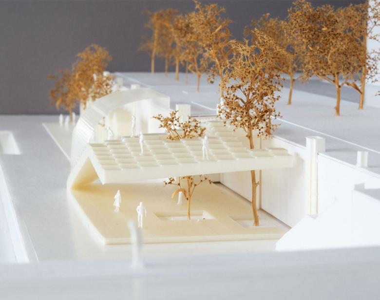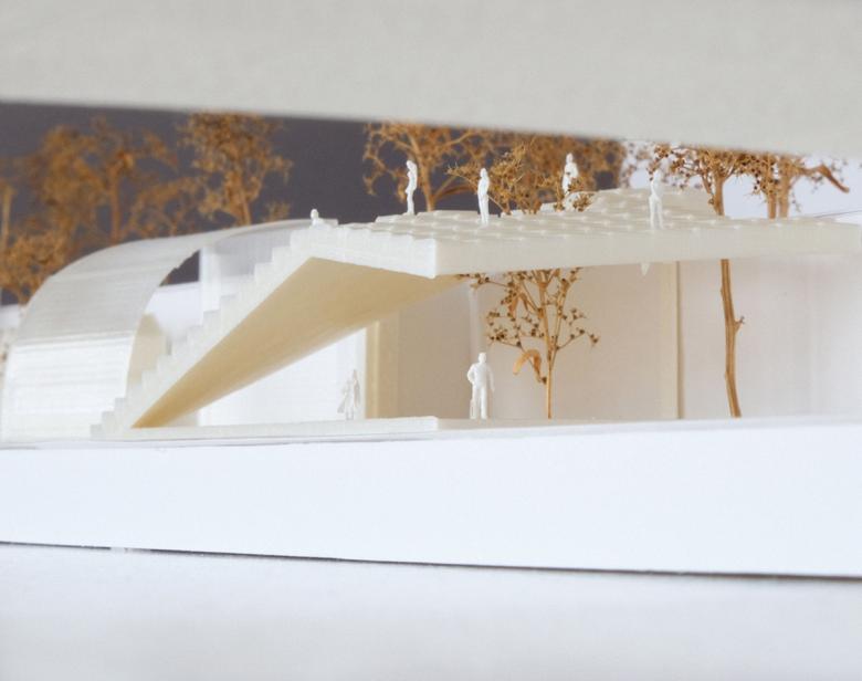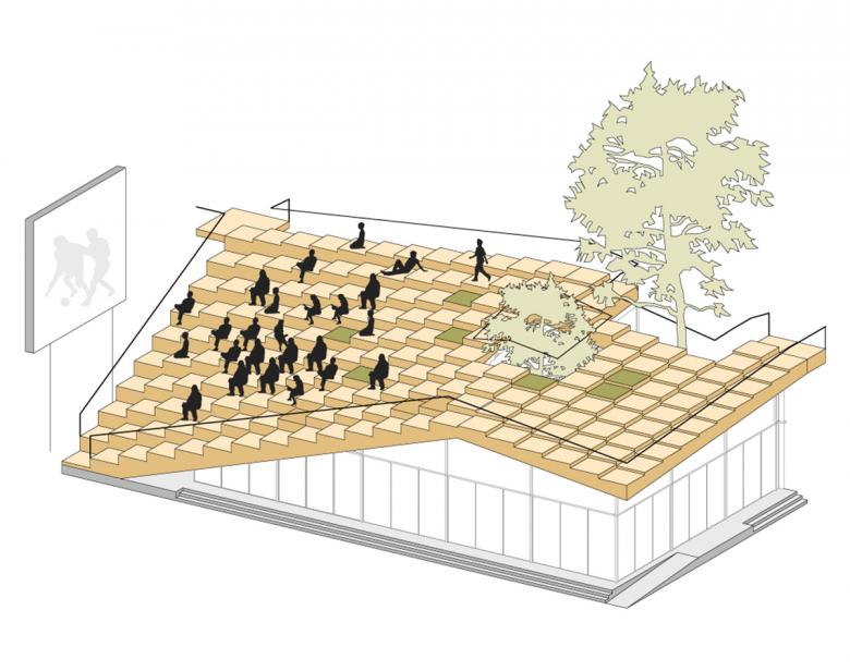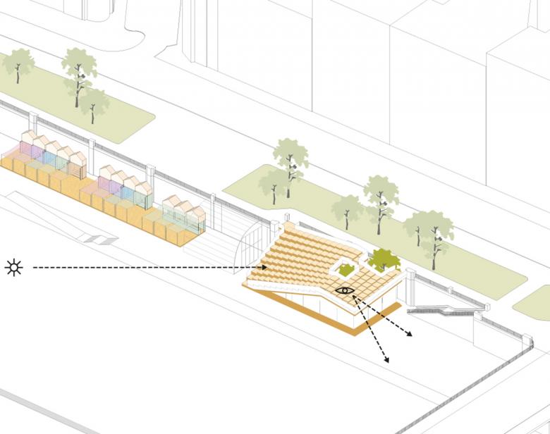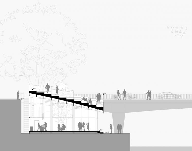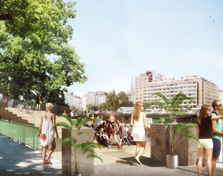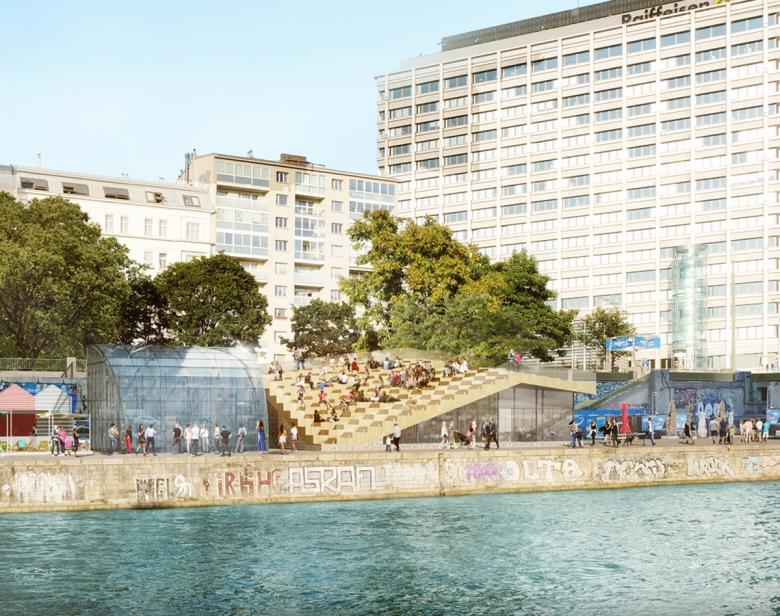 Die Adria am Donaukanal: Entlang der Promenade am Donaukanal verläuft einer der beliebtesten urbanen Räume Wiens. Nördlich einer bestehenden tonnenförmigen Struktur aus Glas knickt eine multifunktionale Tribüne stufenförmig zum Wasser hinab und dient als Dach für den darunter liegenden Raum sowie als begehbare Fläche mit Blick über das Wasser für die Besucher. Die Stufen auf dieser Fläche sind gen Nord-West ausgerichtet und versprechen sonnige Abendstunden. Der Raum unter der Dachfläche ist für den gastronomischen Betrieb konzipiert und bietet auch Platz für kulturelle Veranstaltungen. Die gesamte Tribüne ist als temporäre, vollständig demontierbare und vor allem wiederaufbaubare Grundstruktur aus Holz konzipiert. Südlich des Glasbaukörpers bildet eine Kette aus Strandhütten ein Ensemble, das sich entlang einer besandeten Ebene zieht und die mediterrane Adria an das Ufer des Wiener Donaukanals bringt.