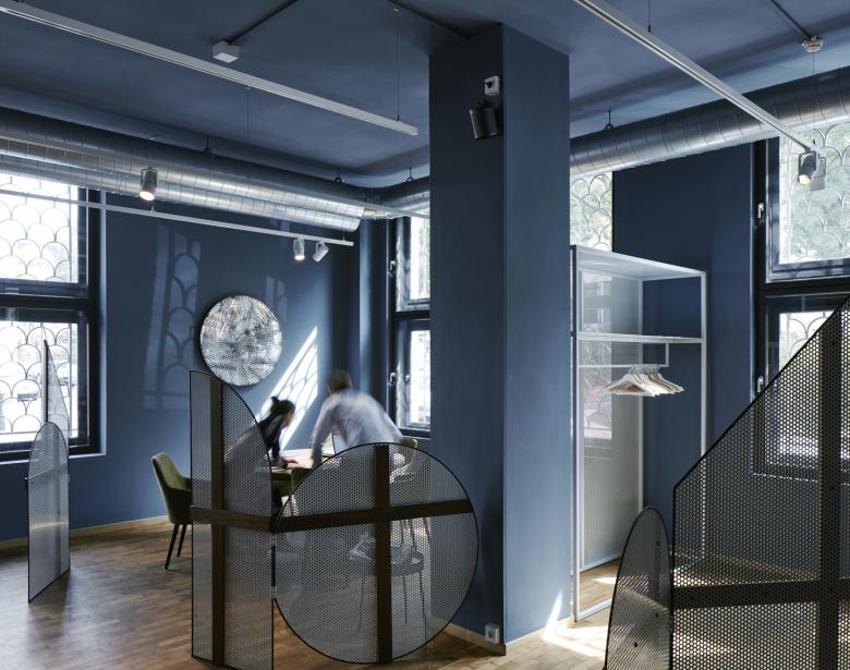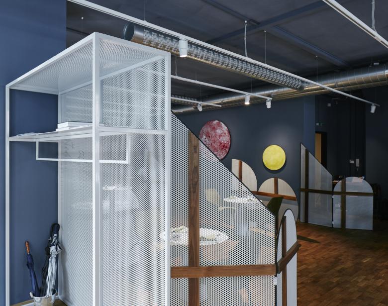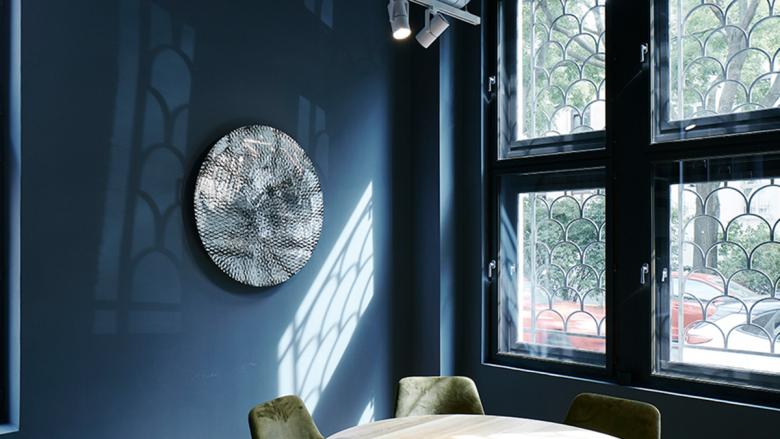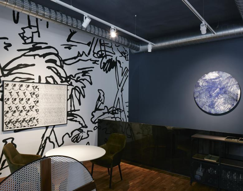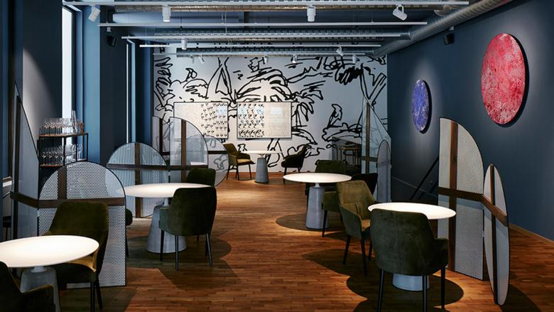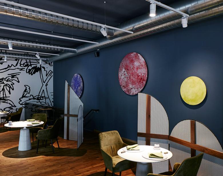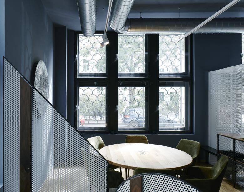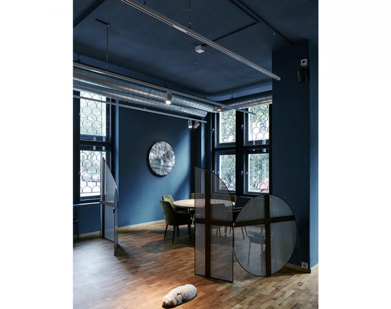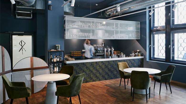 Mitten in Wiens buntem 15. Bezirk erhebt sich das ehemalige Dorotheum-Depot. Das denkmalgeschützte Gebäude aus den 20er Jahren wurde kürzlich revitalisiert und beherbergt heute das Restaurant Herzig. Den Vorstellungen des Auftraggebers folgend, sollte das Lokal im Erdgeschoss das minimalistische, industrielle Flair einer New Yorker Galerie verströmen und vor allem lässig und originell sein. Den großzügigen und zurückhaltend gestalteten Raum prägen mehrere Einflüsse: Hier begegnen sich der originale 100 Jahre alte geölte Eichenboden, deckenhohe Gitterfenster und Wände in sattem Petrol, die mit der Kunst von Clemens Wolf in den CMYK Farben sowie einer wandfüllenden Arbeit von Peter Jellitsch belebt werden. Die Bar wurde mit handverarbeiteten Fliesen verkleidet, in deren Muster das Logo des Restaurants zu erkennen ist. Polsterstühle in olivfarbenem Samt von Marco Dessi für Wittmann umschließen die runden Tische und setzen einen leichten Farbakzent. Die halbhohen Paravents wurden speziell für den Raum entworfen und werden zum stilbildenden Merkmal des Lokals.