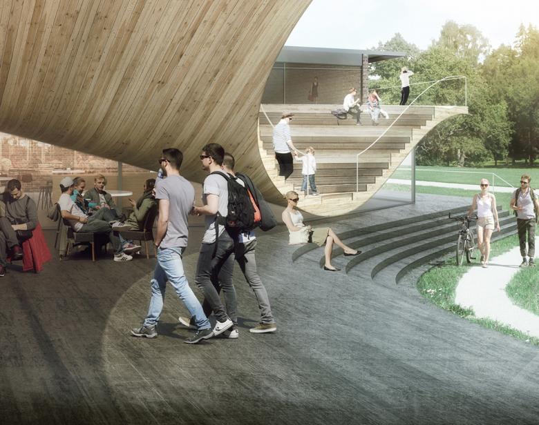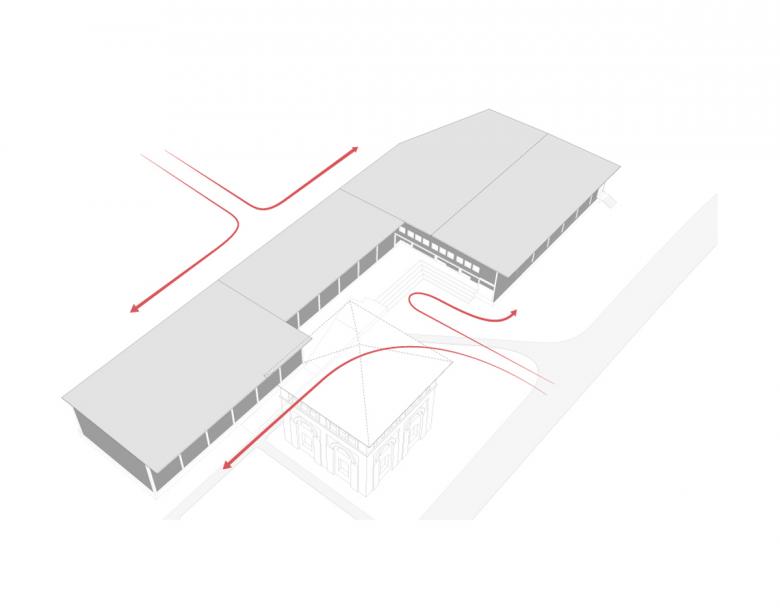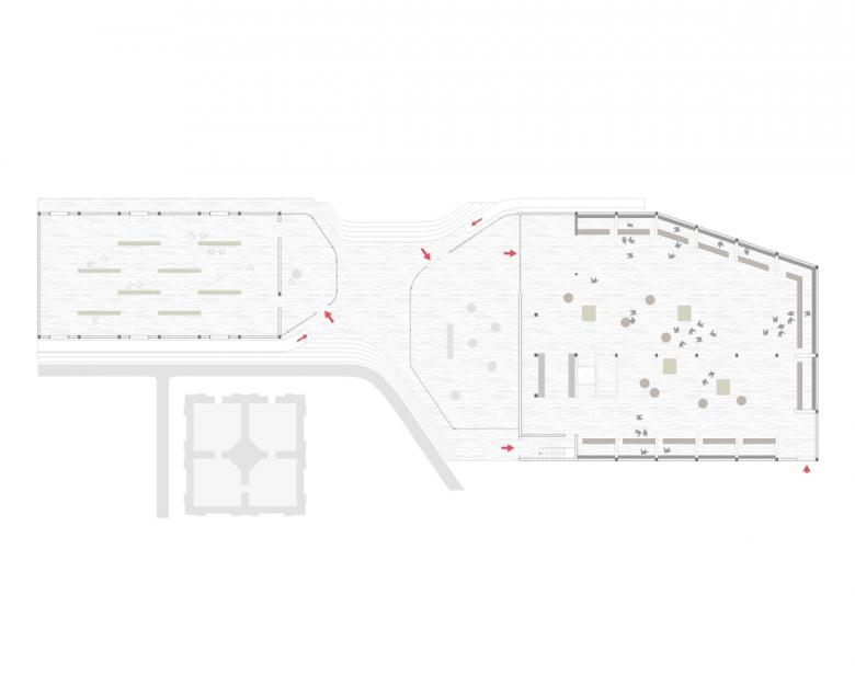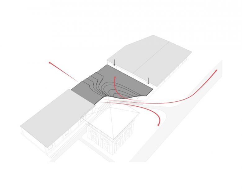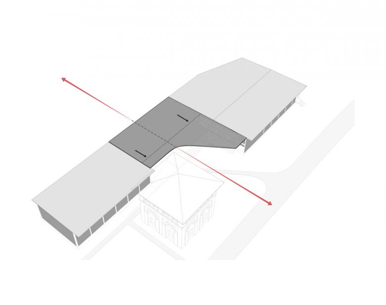 Ein denkmalgeschützter Wasserturm und eine Hallenanlage des Güterverkehrs bilden die Besonderheit des Areals, künftig umgeben von Neubauten. Ziel ist die Realisierung öffentlicher und halböffentlicher Räume als Orte der Identifikation. Durch die Öffnung der longitudinalen Hallengebäude im Zentrum entsteht eine Verbindung zwischen Naturraum und den östlichen Wohnbauten. Der Entwurf des „Zwischenraums“ als offener Pavillon definiert ein Quartiersmanagement und einen gastronomischen Betrieb, das Dach fungiert als Aussichtsplattform über das Areal. Die restlichen bestehenden Hallen bleiben in ihrer Substanz erhalten: der südliche Hallenbereich dient als Veranstaltungsstätte und der nördliche Bereich als Wochenmarkt und Nahrversorgungsbetrieb.
