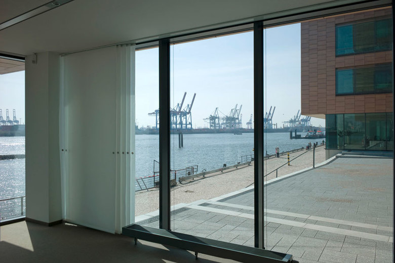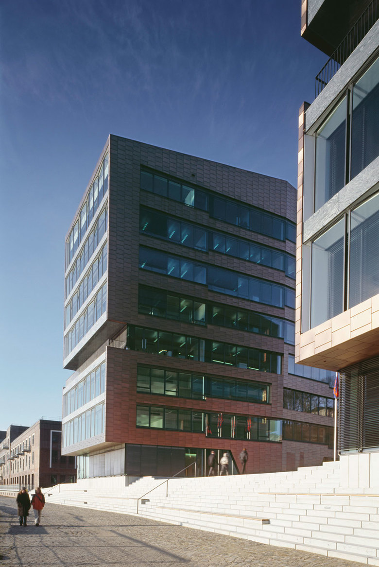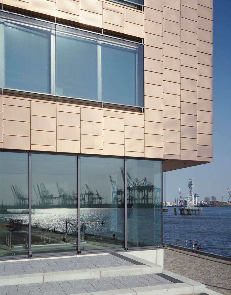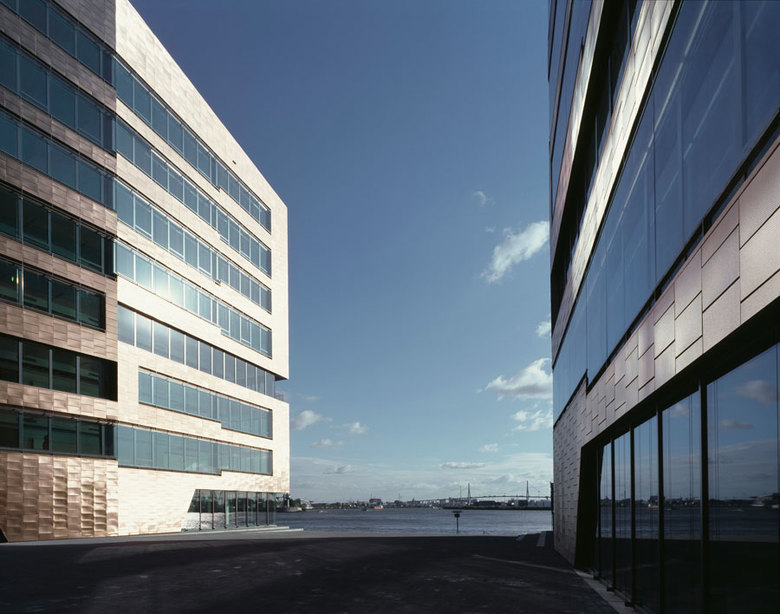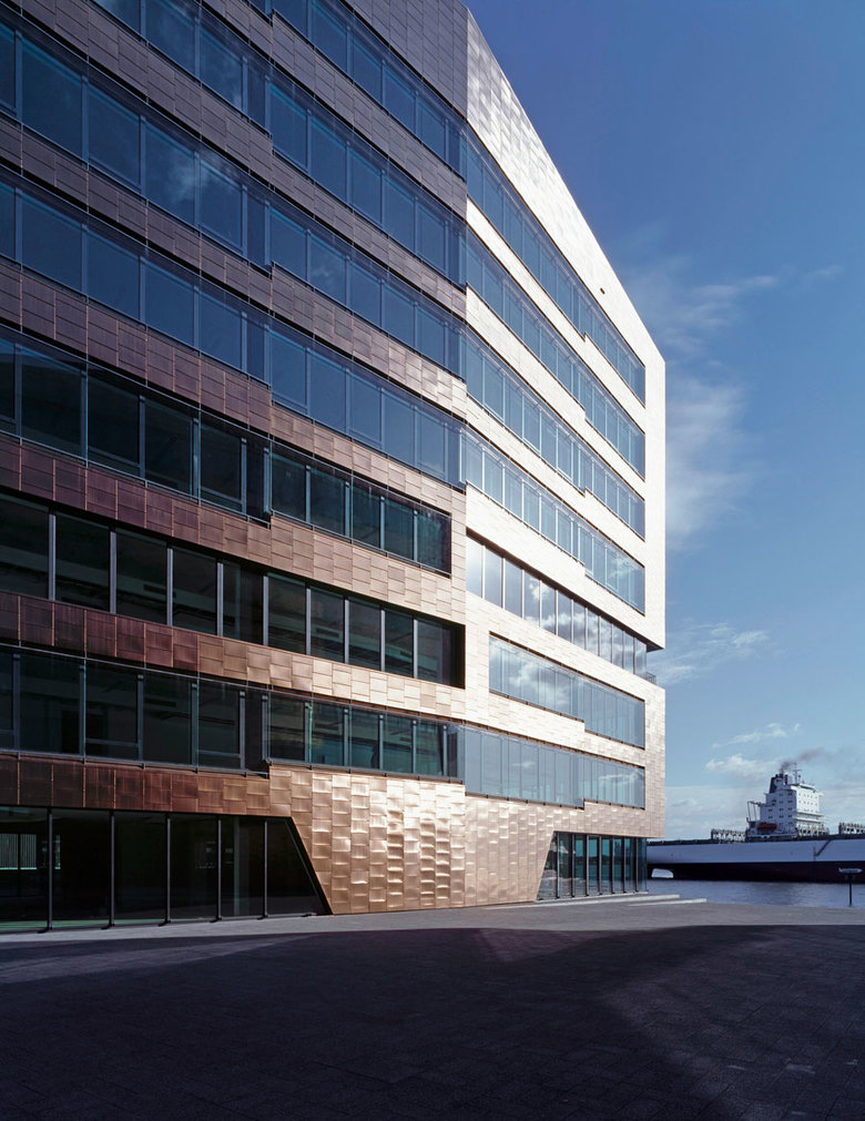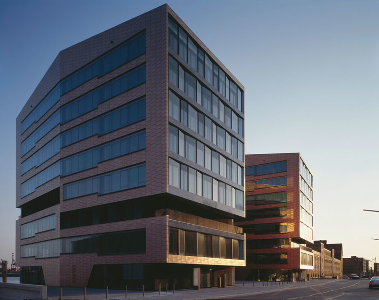 Die beiden Gebäudevolumen der Zwillingstürme verstehen sich als Fortsetzung der östlich des Grundstücks gelegenen Baukörper, der sogenannten Perlenkette am Hamburger Hafen, und des Speichers.