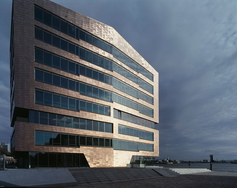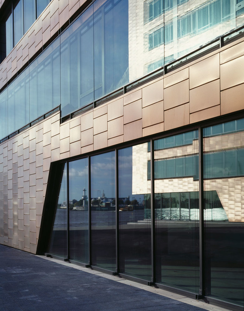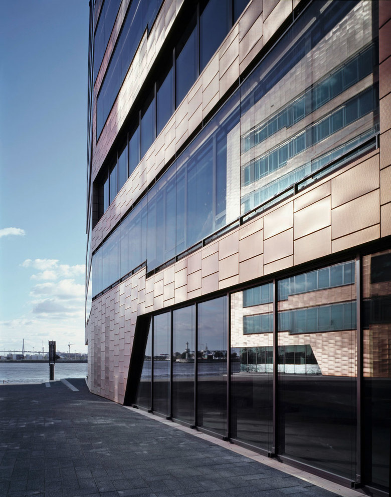 Alte Elbspeicher mit ihren warmen Rottönen standen Pate für den außergewöhnlichen Entwurf. Das Fassadenmaterial der beiden rotgolden schimmernden Türme, inspiriert durch die umliegende historische Speicherlandschaft mit ihren warmen Backsteinfarben wurde eigens für den Entwurf entwickelt. Die 8-geschossigen Baukörper orientieren sich in ihrer Höhenentwicklung an dem alten Speichergebäude westlich des Kaispeichers D. Durch die gleichartige Ausbildung und Öffnung der Stirnseiten bzw. Fassaden nach Norden und Süden erhalten die Türme quasi zwei Vorderseiten.