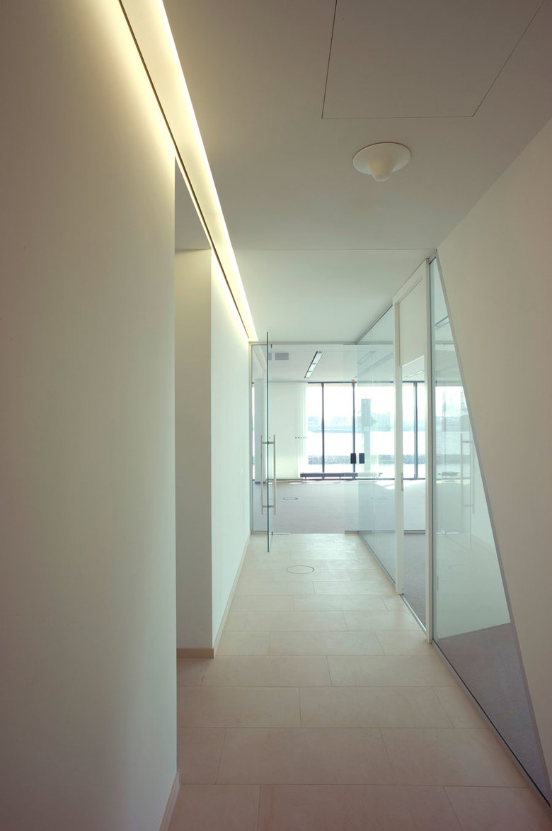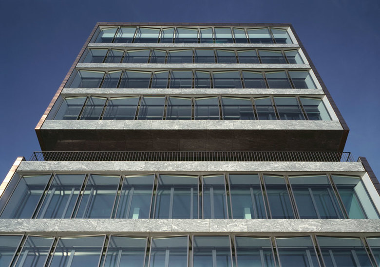 Die zwei markanten Solitärbaukörper zollen mit ihrer spannungsvollen Silhouette und hoher Objektqualität dem Standort Rechnung. Diese Objektqualität wurde erreicht durch eine Verschlankung der Baukörper zu den Stirnseiten, welche den Bezug zu den Ansichtsbreiten der ‚Perlenkette‘ schafft, die Proportionen verbessert, die optische Länge der Längsseiten verkürzt und damit für eine größere Vertikalität und Eleganz der Volumen sorgt. Die Baukörper werden durch Sonderbereiche in Form von geschosshoch verglasten Einschnitten horizontal getrennt.