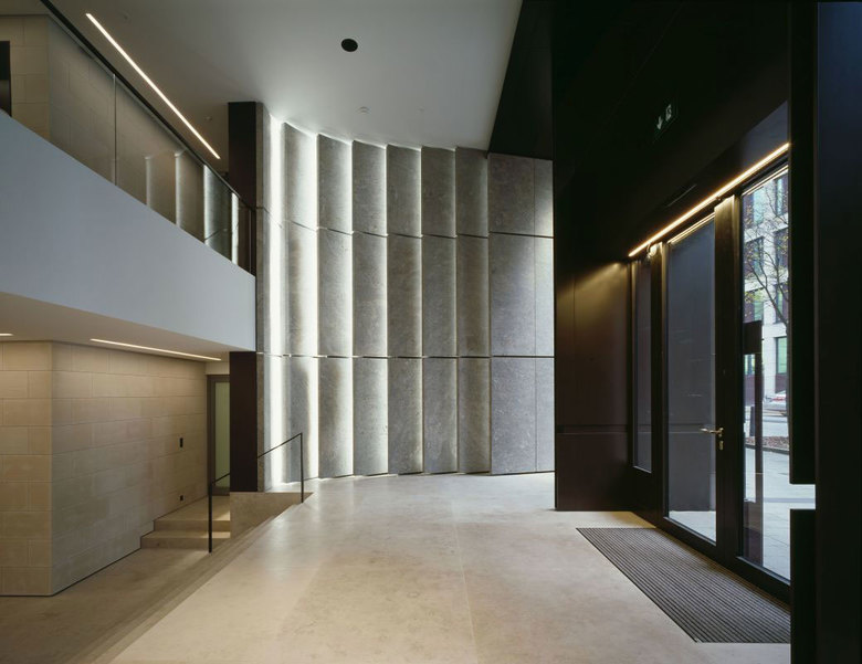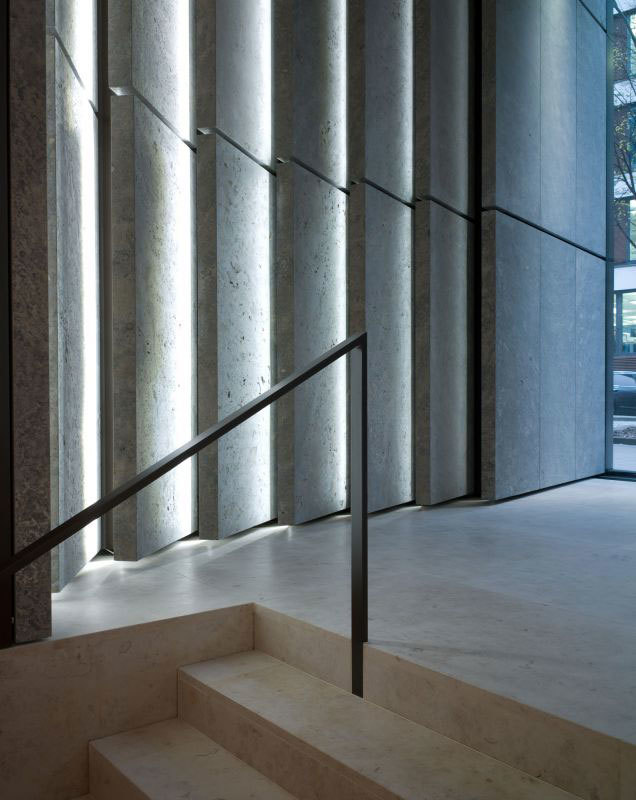 On the inside, the former side wing of the floor space of gallery level of the first floor has been reduced, in order to create this generous and open double height entrance. The inside walls and floors are made of natural stone. Similar to a chuck in a fine coat, the textured limestone wall linings of the foyer protuberance continue onto the street up to the glass level. The two story high limestone elements indicate a welcoming gesture, whilst turning step by step with each panel the positioning by 90 degrees in the inside area and are each separated by a gap. The indirect lighting makes the limestone areas glow. The effect of this designed foyer is like a lamp shade that radiates onto the street.