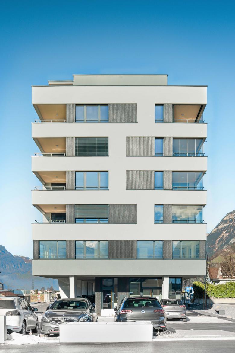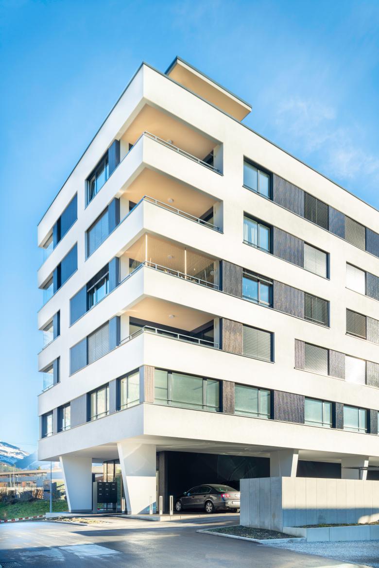 Das Konzept basiert auf umfassenden, die Demographie und den Mikrostandort berücksichtigende Analysen durch CAS Ökonomie. Das Architekturkonzept orientiert sich an den Volumen des Quartierrichtplans. Das eingezogene Erdgeschoss lässt den Baukörper schweben und vermittelt eine gewisse Leichtigkeit. Mit der präzisen Positionierung des Gebäudes und dessen sechs Vollgeschossen wird für die Entwicklung des Bahnhofareals eine Signalwirkung erzielt. Der Baukörper ist als Vierspänner organisiert, die Wohnungen werden mit lediglich zwei Treppenhauskernen effizient erschlossen. Die bandartige, klar gegliederte Struktur der Fassade verleiht dieser einen hochwertigen, repräsentativen Charakter. Jede Wohnung verfügt über eine Loggia. Die klare Formensprache wird im Innern weitergeführt. Minergie-Standard mit kontrollierter Wohnraumlüftung ist selbstverständlich.