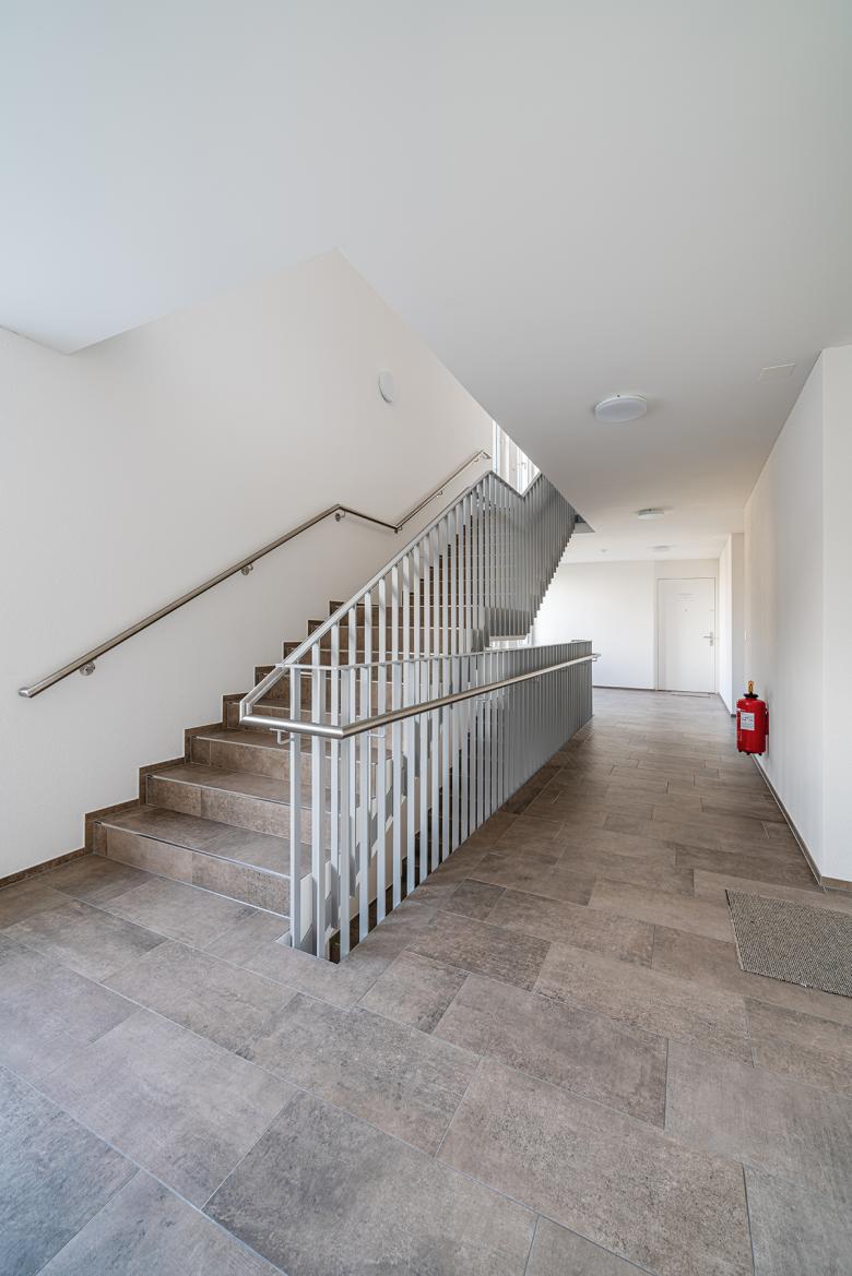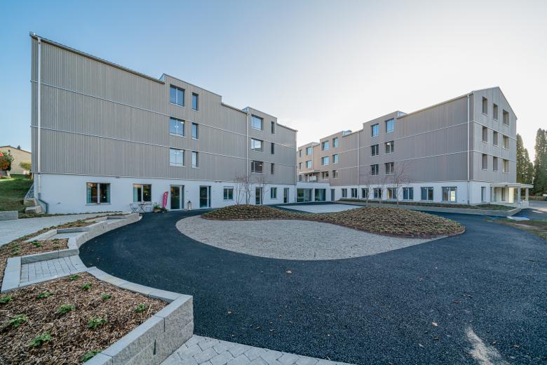 Zwei Hauptbaukörper mit 27 Wohneinheiten formen städtebaulich eine gefasste Hofsituation, die als Begegnungszone gestaltet ist.