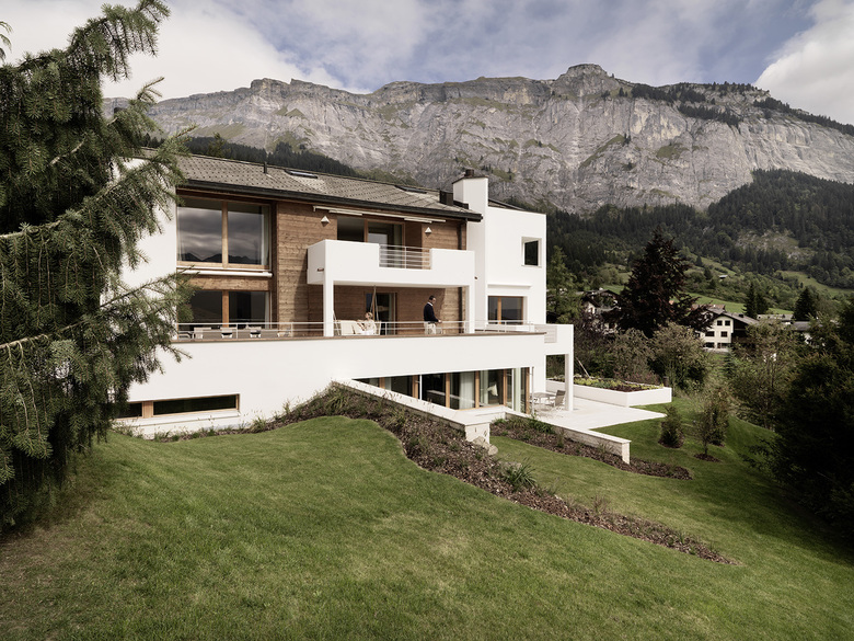 Die Neuaufteilung des Gartens mit einer grosszügigen Sonnenterrasse verbindet diese Wohnungen mit dem früher erstellten Gemeinschaftsbereich. Die Familie möchte den Sitz in den Bergen vermehrt im Sommer nutzen.