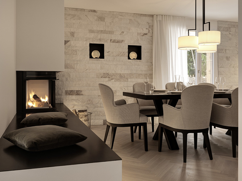 Das Design der Wohnungen nimmt gewisse Gestaltungsmerkmale des darunterliegenden Gemeinschaftsbereichs auf und interpretiert diese in einer wohnlichen und gemütlichen Art neu. So erhält die textile Ausgestaltung einen grösseren Stellenwert und dient darüber hinaus dazu, gewisse Raumzuteilungen im Wohnbereich flexibel gestalten zu können.