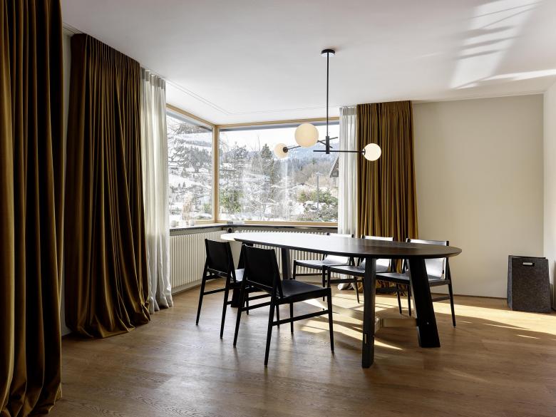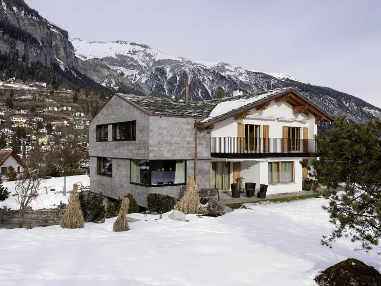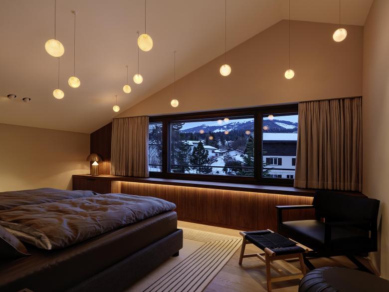 Die neue Besitzerfamilie wünschte sich den freien Blick in die Bergwelt – und dies aus einem neuen Elternschlafzimmer mit Ankleide im Dachstuhl. Es wurde mehr daraus. Das langgezogene Steinplattendach wurde im Rahmen der Aufstockung aufgerissen und ein Quernau eingepasst, der zwei neue Schlafzimmer mit Bergsicht beherbergt. Die Übernahme des bestehenden Eckfensters in die neue Fassadengestaltung erforderte auch, die Fenster in der bestehenden Küche grundlegend zu verändern und in die neue Hauptfassade über der Einfahrt zu integrieren. Die neuen Räume wurden mit hochwertigen Materialien detailliert ausgearbeitet und durch ein witziges und qualitativ hochwertiges Lichtkonzept ergänzt.