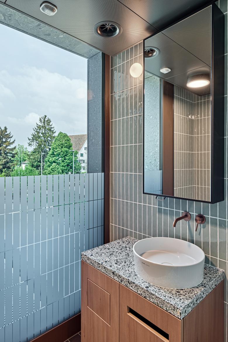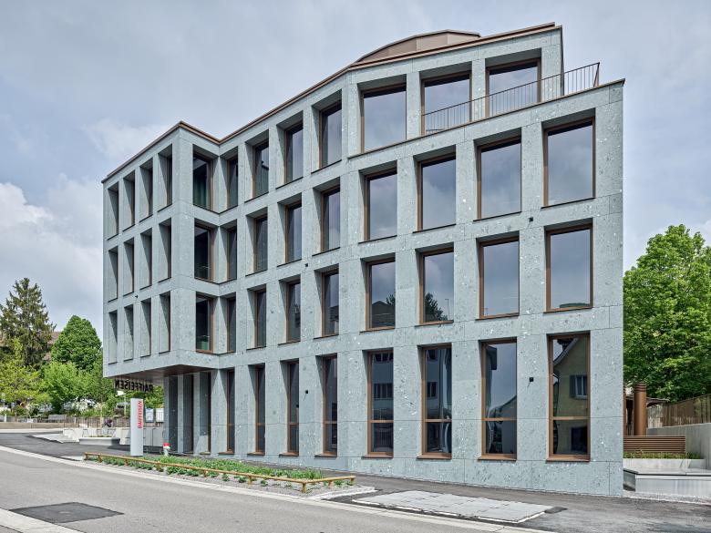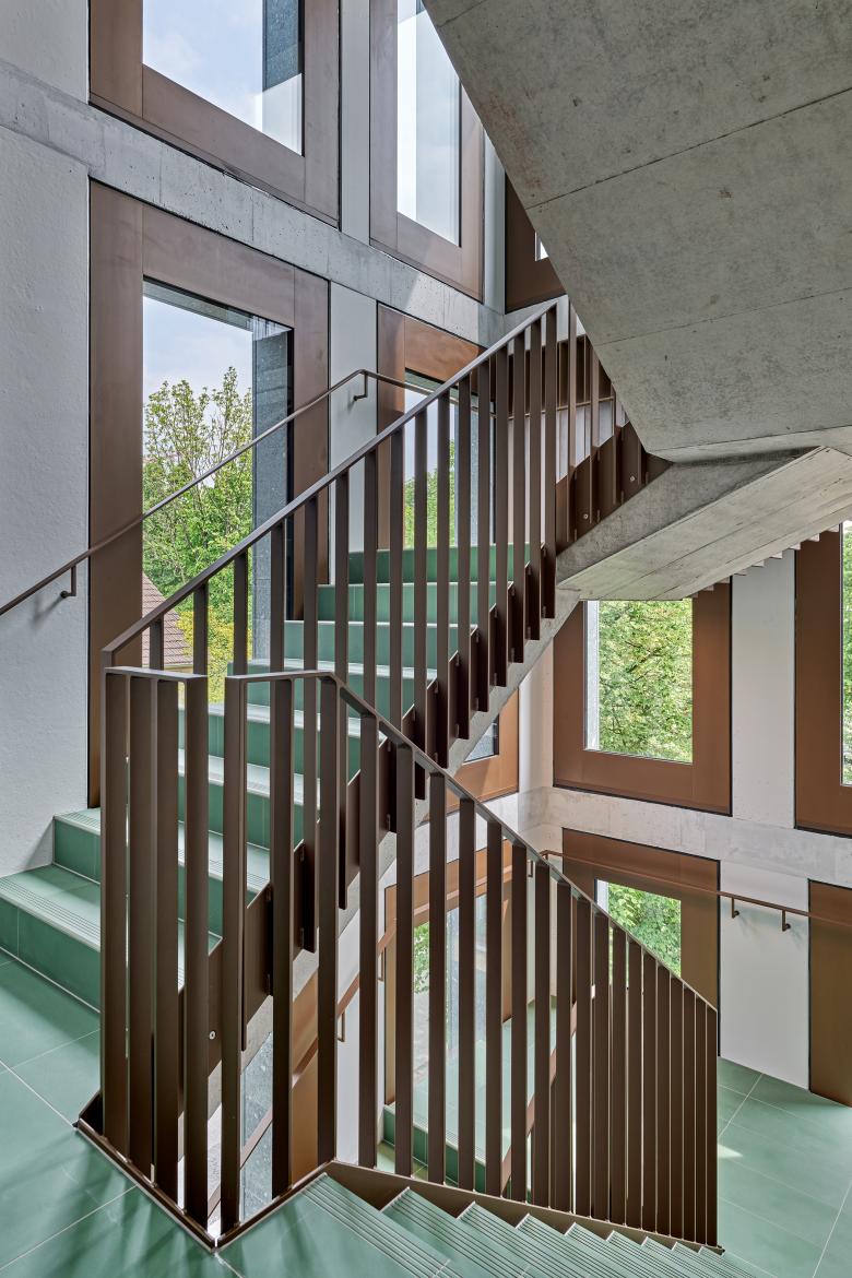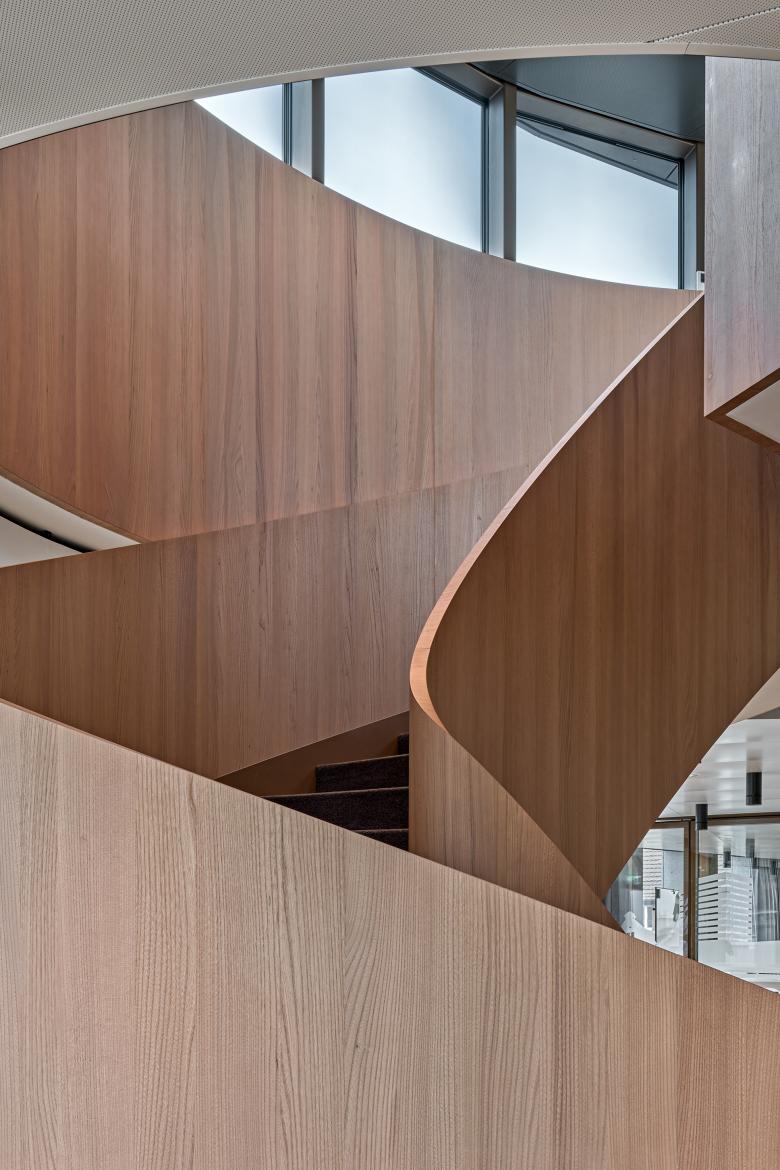 Der Bearbeitungsperimeter für den Ersatzneubau der Beratungsbank liegt prominent an der Bahnhofstrasse 1 im Zentrum von Wallisellen. Das neue Bankgebäude tritt am höchsten Punkt der Bahnhofstrasse als markanter Bau in Erscheinung. Von Westen hergesehen, stellt es den Auftakt zum neu gestalteten Abschnitt der Bahnhofstrasse dar. Klare Linien, eine logische Struktur und eine präzise Detaillierung prägen das Erscheinungsbild des neuen Bauwerks. Dennoch schaffen die grossen Glasflächen Transparenz und Leichtigkeit, was Offenheit und Kommunikationsbereitschaft vermittelt. Die Fassadengestaltung ist klar und ruhig mit Akzenten, die aus den besonderen Innenräumen –Büroräumen, Veranstaltungssaal oder Mensa – schlüssig abgeleitet werden. Die Formensprache entwickelt sich aus dem städtebaulichen Konzept zur Eröffnung der strassenbegleitenden Bebauung entlang der Bahnhofstrasse und der Schaffung eines städtischen Platzes an der Kreuzung zur Rotackerstrasse. Die Fassade ist klassisch in Sockel, Regelfassade und zurückversetztes Attikageschoss gegliedert. Die Grundrisse sind klar und übersichtlich geordnet. Unter der ellipsenförmigen Dachskulptur entfaltet sich über mehrere Ebenen eine lichte Bürolandschaft, die grosszügige Begegnungsräume schafft. Ihren besonderen Charakter erhalten diese modernen Begegnungsorte durch ein altes Thema: die Treppe.