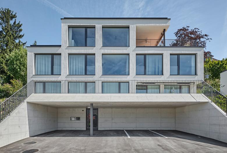 Die beiden identischen Gebäudevolumen bilden autarke Einheiten. Die stringente Gebäudeplanung strukturiert die Wohnungsgrundrisse und ist auch in der Fassade mit ihren grosszügigen Fensteröffnungen nach Westen ablesbar.