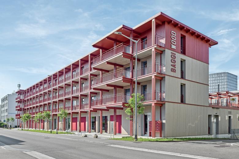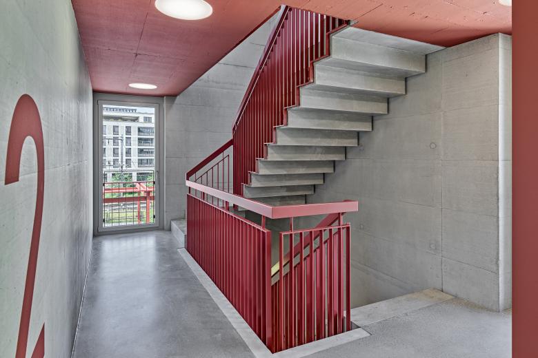Die Gestaltung der Fassade folgt dem Konzept eines städtischen Holzbaus. Der Einsatz von Farbe und die Detailierung unterstreicht den urbanen Kontext und gibt dem Neubau eine unverwechselbare Identität entlang der Neugutstrasse.