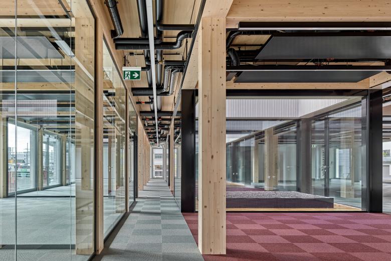 Der Neubau wurde als konstruktiver Holzbau auf einem massiven Untergeschoss konzipiert. Das Erdgeschoss ermöglicht eine flexible Büronutzung, welche in zwei Mietflächen mit gemeinsamen Flächen (Pausenraum, Sitzungszimmer etc.) eingeteilt werden kann. Kleine Aussenhöfe in der Mittelzone belichten die Bürofläche und können als Aussenräume von den Beschäftigten genutzt werden. In den oberen drei Geschossen befinden sich Kleinwohnungen, welche sich mit einem kleinen Balkon nach Süden zu den Geleisen der SBB und Glatttalbahn, sowie nach Norden gegen die Neugutstrasse ausrichten. Erschlossen werden die 24 Mietwohnungen über einen Laubengang, welcher als einer der angedachten Begegnungsorte dem sozialen Austausch unter den Mietern dienen soll. Ein zweiter Begegnungsort befindet sich auf dem Dach über dem Erdgeschoss, welcher mit einem Holzdeck zoniert und einer Pergola gedeckt wird. Dieser Aussenraum bietet sich an für Veranstaltungen und Feste und kann von den Bewohnern sowie den Beschäftigten genutzt werden.