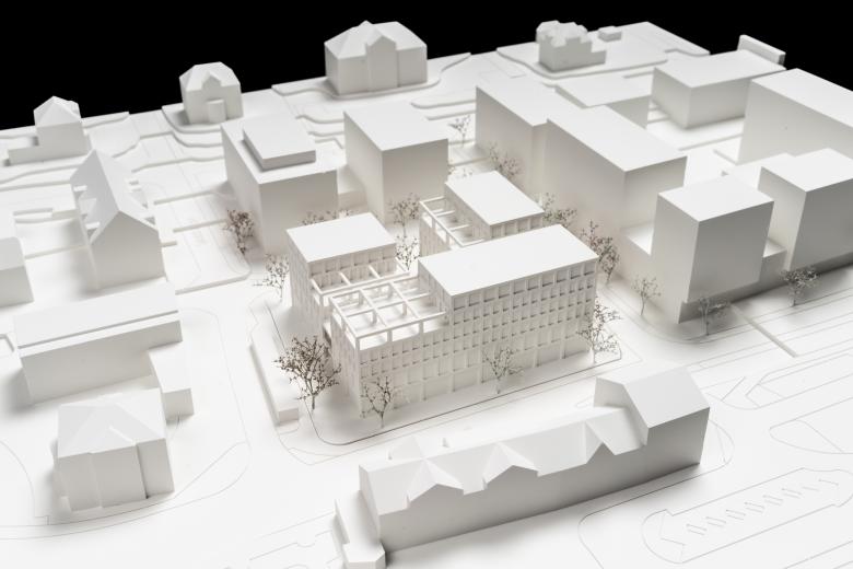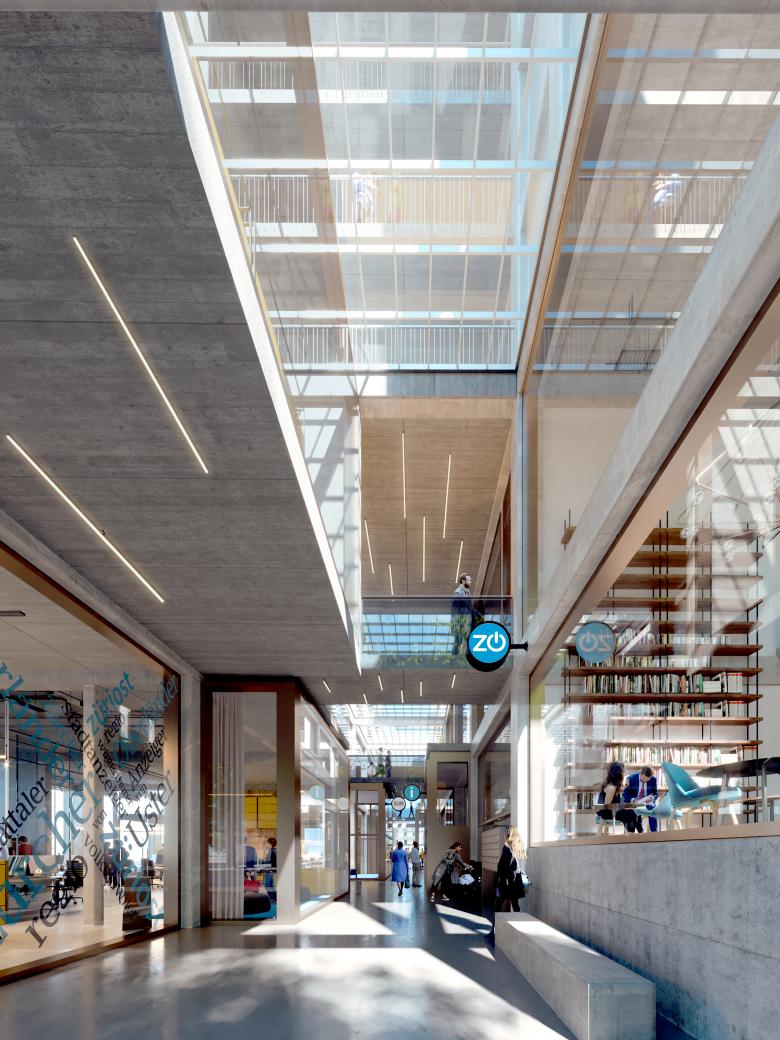 Das Areal des Verlags- und Medienhauses der Zürcher Oberland Medien liegt zentral in Wetzikon, in direkter Nachbarschaft zum Bahnhof und Bushof. Es grenzt an die stark verkehrsbelastete Rapperswilerstrasse wie auch an das Gestaltungsplangebiet Pestalozzistrasse. Neben der städtebaulichen Situation reagieren wir mit dem Neubau auch auf die gesellschaftliche Diskussion über die Rolle der Medien in Zeiten der Digitalisierung. Nicht nur kommunikativ, sondern auch baulich wird ein Maximum an Transparenz und Offenheit geschaffen: Das Gebäude ist über die ‹News Street› sowohl von der Spital- wie auch der Pestalozzistrasse her zugänglich und durchquerbar. Raumhohe Verglasungen ermöglichen es, die Medienschaffenden bei ihrer Arbeit zu beobachten. Die Transparenz trägt dazu bei, die Grenzen zwischen aussen und innen etwas aufzulösen. Ein weiterer Schwerpunkt des Entwurfs lag beim Thema Vernetzung: Alle Erschliessungsflächen wurden vor dem Hintergrund der Prämisse gestaltet, dass sie auch als Kommunikationsflächen dienen.