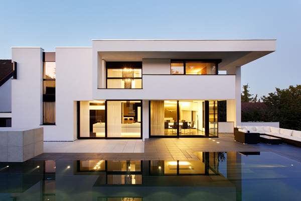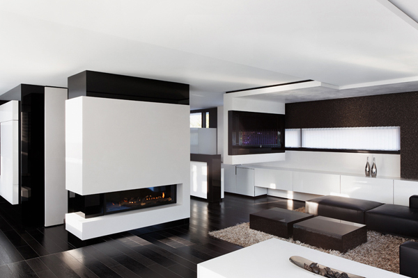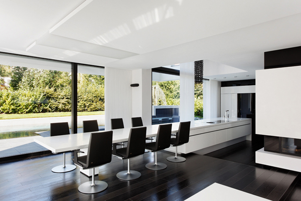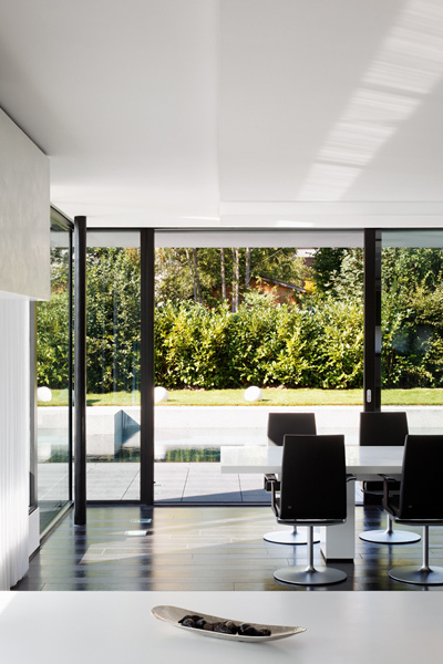 Die Villa in Hanglage ist durch den Kontrast zwischen weißem Putz und zurückversetzten schwarzen Elementen betont. Im Inneren wird das gleiche Gestaltungskonzept angewendet, sodass ein harmonisches Gesamtbild entsteht.