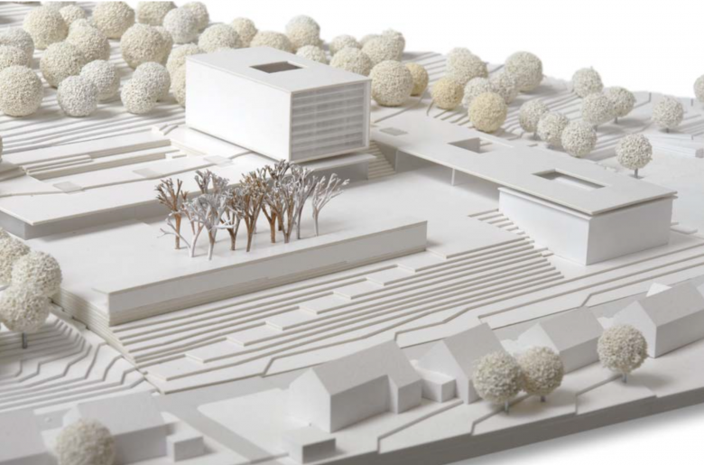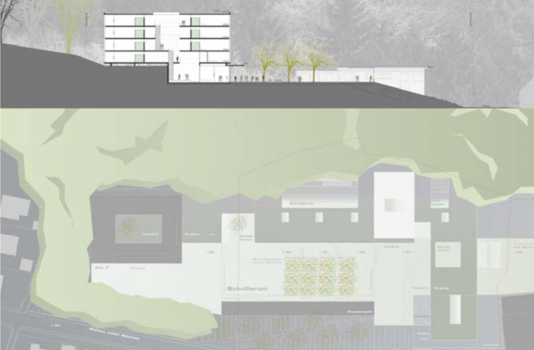 Die Raumkante des Schulhofs wird neu gefasst und soll hier zu einem lebendigen Campus gestaltet werden mit vielfälti- gen Höhen- und Blickbeziehungen. Wesentliches Ziel ist die Schaffung von mehreren Raumfolgen mit unterschiedlichem Charakter, die sich zwischen den einzelnen Baukörpern bilden. Eingänge, Verbindungen, Treppen, Wege und Zugänge werden somit Teil des Gesamtkonzeptes.