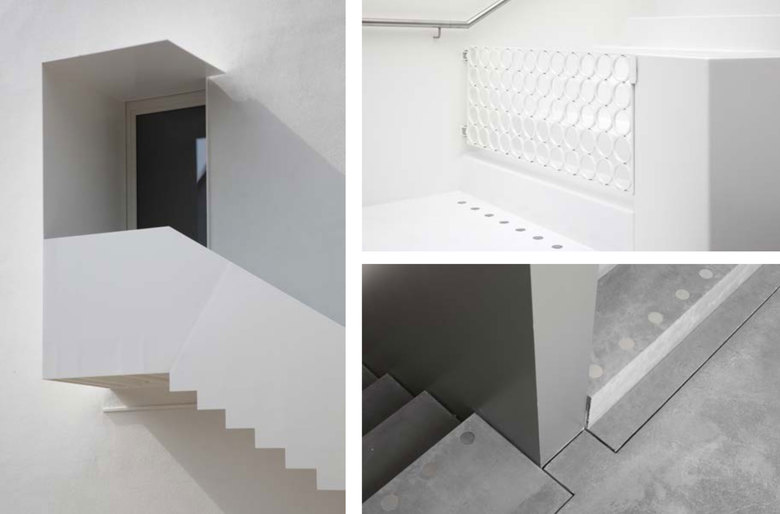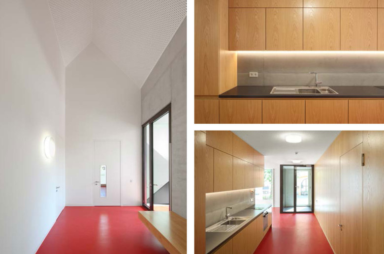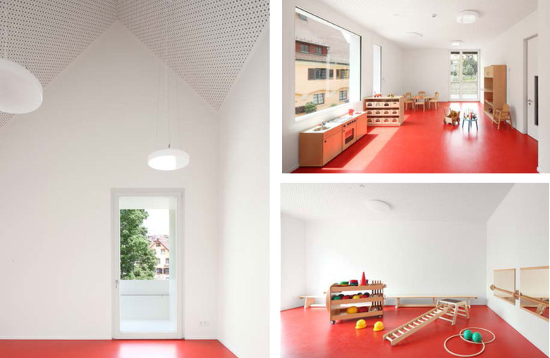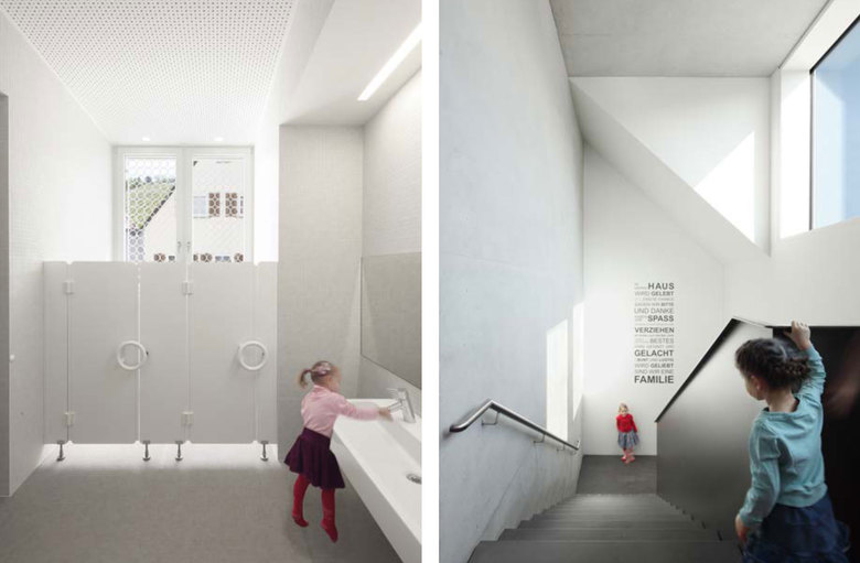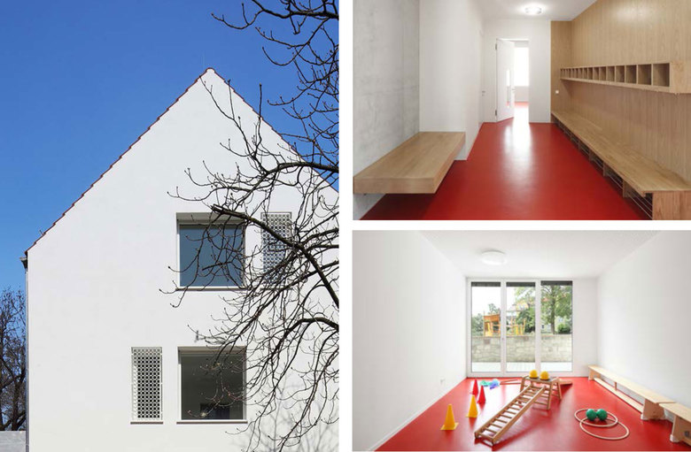 Wichtig war ein reduziertes Material- und Detailkonzept, das die Komplexität eines solchen Raumprogramms auf so knappem Grund und in einer für solche Bauaufgaben ungewöhnlichen Haustypologie überhaupt ermöglicht. Das harmonisch kombinierte Farbkonzept im Inneren, unterstreicht das „kunterbunte“ Treiben in der Kita (Kinder 0-6 Jahre). Sinneserfahrungen anzuregen war bewusst Teil des architektonischen Entwurfes. Die äußere Hülle ganz in weiss gehalten, verleiht dem neuen Baustein am Ort einen eleganten Glanz und dem „Kínderhaus“ so auch eine poetische Note. Die monolithische einfache Ziegelbauweise ohne WDVS und das klassische Satteldach mit bündigem Ortgang und knapper Traufe sollen den „Urtyp“ Haus dabei noch unterstreichen.