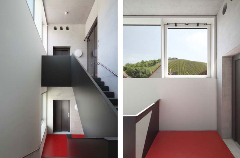 Einfache Grundrissdispositionen bieten eine maximale Ausnutzung der Grundfläche und kommen mit variablen Raumgrößen dem Wunsch des pädagogischen Konzeptes „Einstein in der Kita“ nach. So sind die Räume windmühlenartig um ein knappes Foyer angeordnet und bieten an gezielten Stellen, mit ihren bewusst gesetzten Öffnungen, eine stadträumliche Verknüpfung. So ergeben sich immer wieder überraschende, inszenierte Ausblicke zum historischen Ort und den Weinbergen.