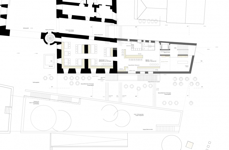 Ziel war es ein zurückhaltendes, skulpturales Gebäude zu schaffen, das sich einerseits im Kontext behaup- tet, andererseits aber gegenüber dem Gesamtensemble „historische Schlossanlage“ in seiner reduzierten Detail- und Materialsprache nicht dominiert. Im Inneren entstehen differenzierte Raumfolgen - rund um das Thema Wein - die Entree und Information, Restaurant im Schloß und Weinprobe am Museumsgraben inner- halb eines Rundgangs aufnehmen.