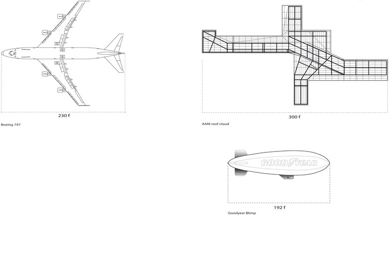 The Roof Cloud, which hovers above the building, creates a blurred envelope for the museum because of its sheer mass and materiality. It encloses interior space, provides shade for exterior spaces, and operates as a horizontal landmark in the city.