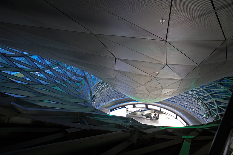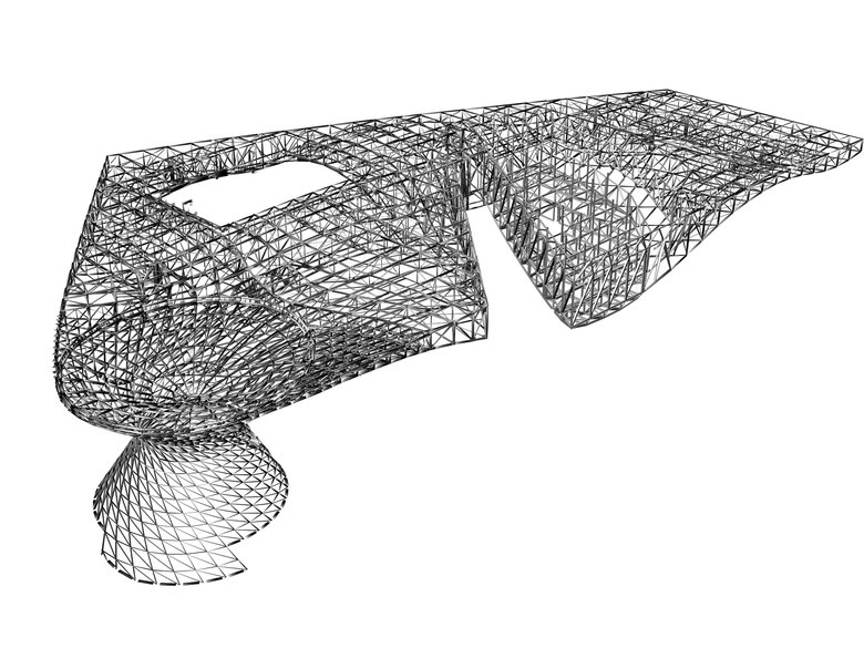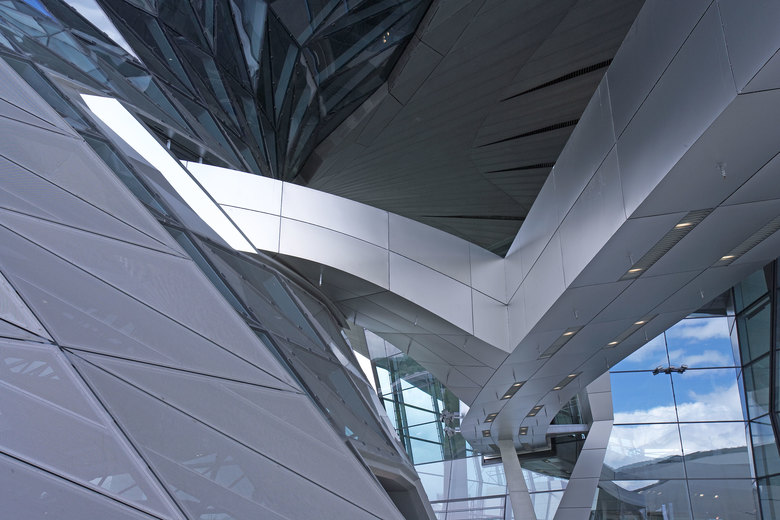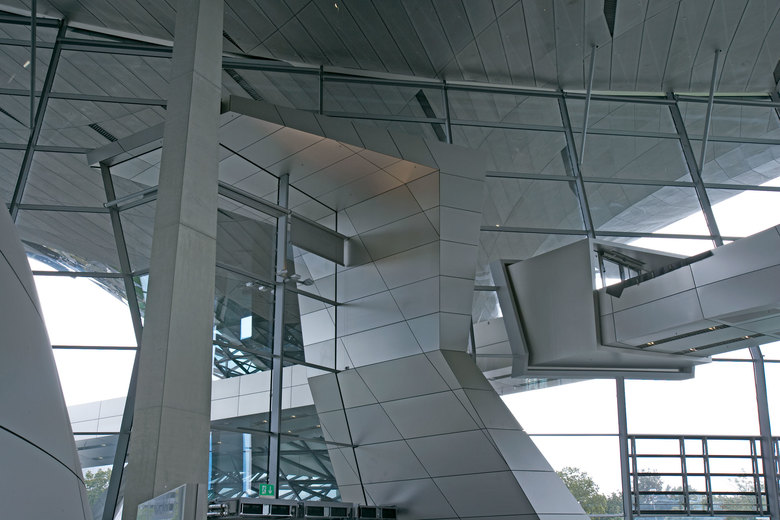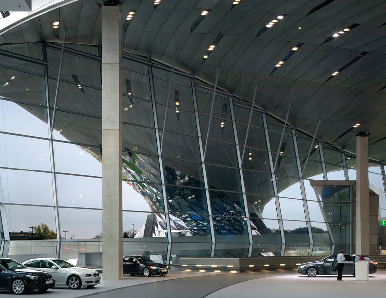 The futuristic BMW Welt architecture is unique. An extension of the underlying Double Cone geometry, the roof takes on the form of a 16,000 m² cloud that appears to float on its supporting structure of only twelve socketed columns. Its basis consists of an upper and lower grid stratum with cells of five by five metres. Between these strata are diagonal struts that interlock the grids into a spatial supporting structure. This powerful and dynamic eyecatcher is perfected by the Double Cone in a prominent position at the head of the entire structure. Caught in a whirl of glass and steel, the tornado twists upward and ends in a roof that takes on the form of a floating, flying cloud. Generated by the dynamic twists of the two supporting strata, this tornado functions as the main bearing for the roof.
