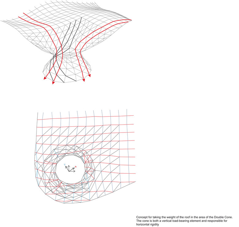 In its functional multiplicity the Double Cone is no less impressive than the structures described above. It, too, is a full-service event realm extending over several levels, including a stage with its own catering infrastructure, rotating platforms and infrastructure connections for events such as concerts, exhibitions and talk shows. The Double Cone also makes it possible to exhibit vehicles from the workshop area. All of these structures take the form of walk-through sculptures in an urban landscape that is overarched by the virtually free-floating roof that originates out of the Double Cone and further differentiates the space into various sub-areas.
