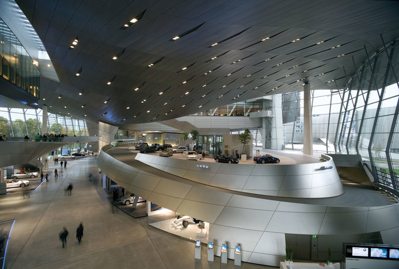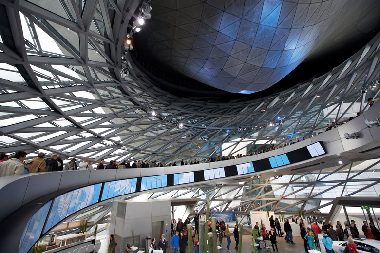 The BMW Welt is a brand experience and car delivery center as well as an event location situated next to the headquarter and the BMW museum. Coop Himmelb(l)au designed a hall with a length of 180 meters, which completes the western corner of the large area. The entrance of the building is defined by a spectacular double cone on the south side, which is the visual icon of the BMW Welt.