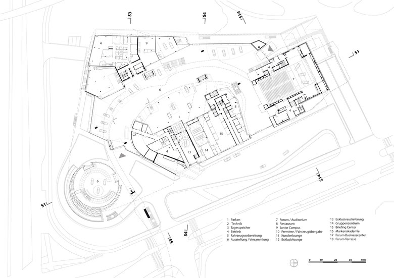 Another key function of BMW Welt is represented by the Forum. Located in the north wing of the building, this section embodies in a particularly striking way the concept of spatial and visual integration coupled with the highest degree of functional independence. The heart of the Forum is an Auditorium for up to 800 persons. Equipped with a variable topography of hydraulic platforms, it can be used for a variety of events, from the annual BMW AG financial press conference to classic theater pieces. Via a liftable gate that can be sunk into the floor across the entire width of the stage space, the Forum can be connected with the Hall to create a new kind of grand-scale event space. The Auditorium was realized as a “space within a space” in acoustic terms, meaning that when the liftable gate is closed, no sound permeates from the Auditorium to the Hall or vice-versa. This makes it possible to hold functionally autonomous events simultaneously in the Hall and in the directly adjacent conference area. The Forum is supplemented by a full-service conference area, which is cantilevered out over 20 meters from the building block of the Forum, dominating the vista toward the north. The conference rooms can be adapted for various situations using mobile dividing walls. The section of the Forum structure visible “above ground” is only the tip of the iceberg. On the lower floors, the Forum includes a truck loading dock, catering kitchens, artists’ dressing rooms and interpreter booths as well as storage spaces and service rooms, which together account for twice the space of the actual core areas.