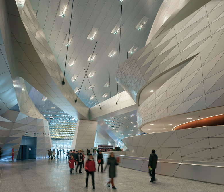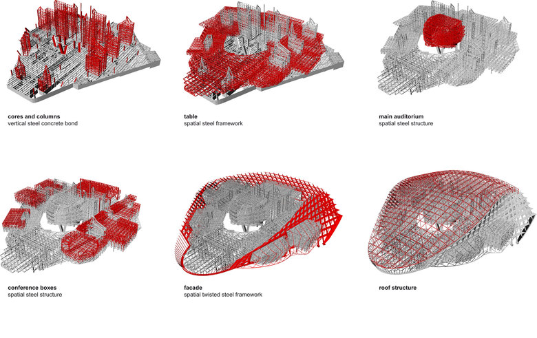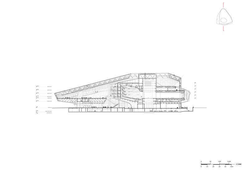 Design – “The building consists of two elements,” Prix explains, “the table and the roof. The opera, conference halls and access zones rest on the table-shaped steel construction, with a three-dimensional deformed façade-roof construction above it.” Both elements are steel space frames with depths ranging between five and eight meters. The whole structure is supported by fourteen vertical cores made of composite steel and concrete. The steel constructions were produced at Chinese shipyards, since these were the only facilities where the 10-cm steel plates could be welded safely and precisely. “At Coop Himmelb(l)au, we are thus putting Le Corbusier’s words into practice, when he said that buildings should be constructed like ships,” Prix says. Modern technology and construction expertise allowed for span widths of more than 85 meters and projections of more than 40 meters.