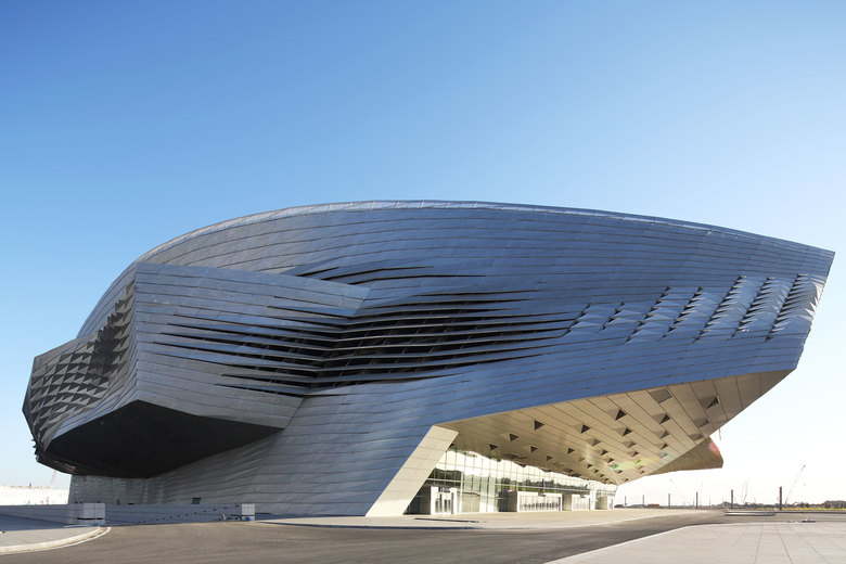 With the International Conference Center, the Viennese architectural studio Coop Himmelb(l)au has constructed an unmistakable landmark for the prospering harbor city of Dalian, China. Opened in 2012 and featuring a shell-shaped roof, the center hosts a multifunctional “small city within a city” with conference and event rooms for 7,000 visitors in a total area of 100,000 m².