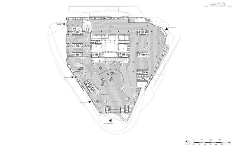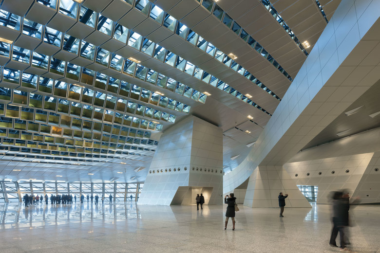 The two major urban axes converging here give rise to the building’s position and basic shape. The conference hall for 2,500 visitors and opera house with 1,800 seats lie in the center of the building beneath the shell-shaped, partially translucent roof. Small conference rooms with numerous usage options surround this core like pearls, forming an internal urban structure with squares and streets that invite visitors to linger and chat – the informal meeting spaces that are so important for conferences. Chill-out zones and catering stations are also located here. The controlled supply of daylight assists the visitors in their spatial orientation and creates a atmospheric variety on the inside. “Despite its enormous size for 7,000 people, the building is as vibrant as a city,” explains Wolf D. Prix, Design Principal and CEO of Coop Himmelb(l)au. “The entry hall has the size of four football fields and reaches up to 45 meters high. Even with this size, the building is not forbidding but rather clearly arranged and inviting.”