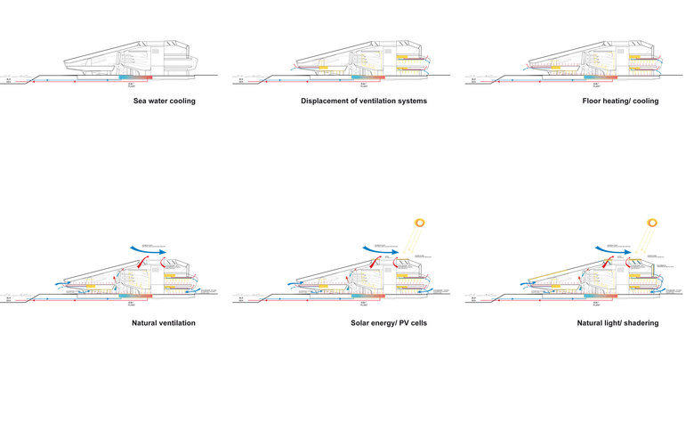 Sustainable energy concept – One of the most important tasks of sustainable architecture is minimizing the energy consumption. It is therefore essential to integrate natural environmental resources. The planners utilized Dalian’s location on the sea, along with the strong wind. More precisely, this means: The relative thermal energy of the sea water and the natural ventilation of the enormous air volumes in the building are used for the cooling in the summer and heating in the winter. Low-temperature systems are used for heating while the thermal mass of the concrete core is activated to keep the building temperature constant. The atrium beneath the roof is conceived as a solar-heated, naturally ventilated sub climatic area. A high degree of natural daylight reduces the energy consumption for artificial lighting and has a positive psychological effect. Integrated into the shape of the building, solar panels provide additional energy.