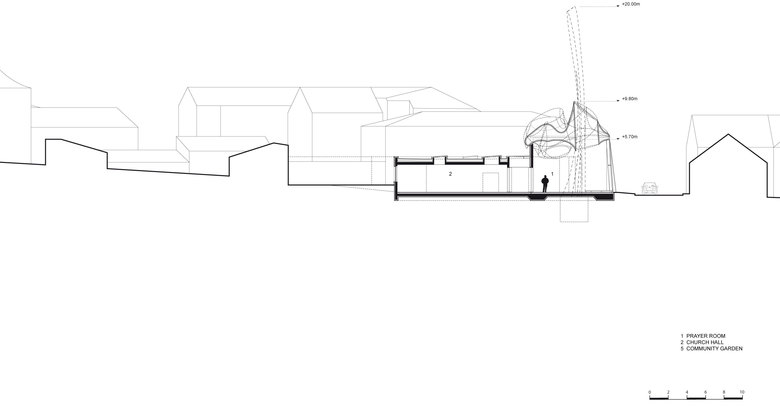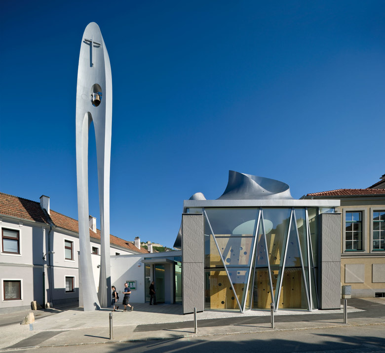 The protestant church consists of four main building elements: a sanctuary, a community hall, a sacristy, and a sculptural bell tower. Coop Himmelb(l)au derived the shape of the building from a huge “table”, with its entire roof construction resting on the legs of the “table” – four steel columns.